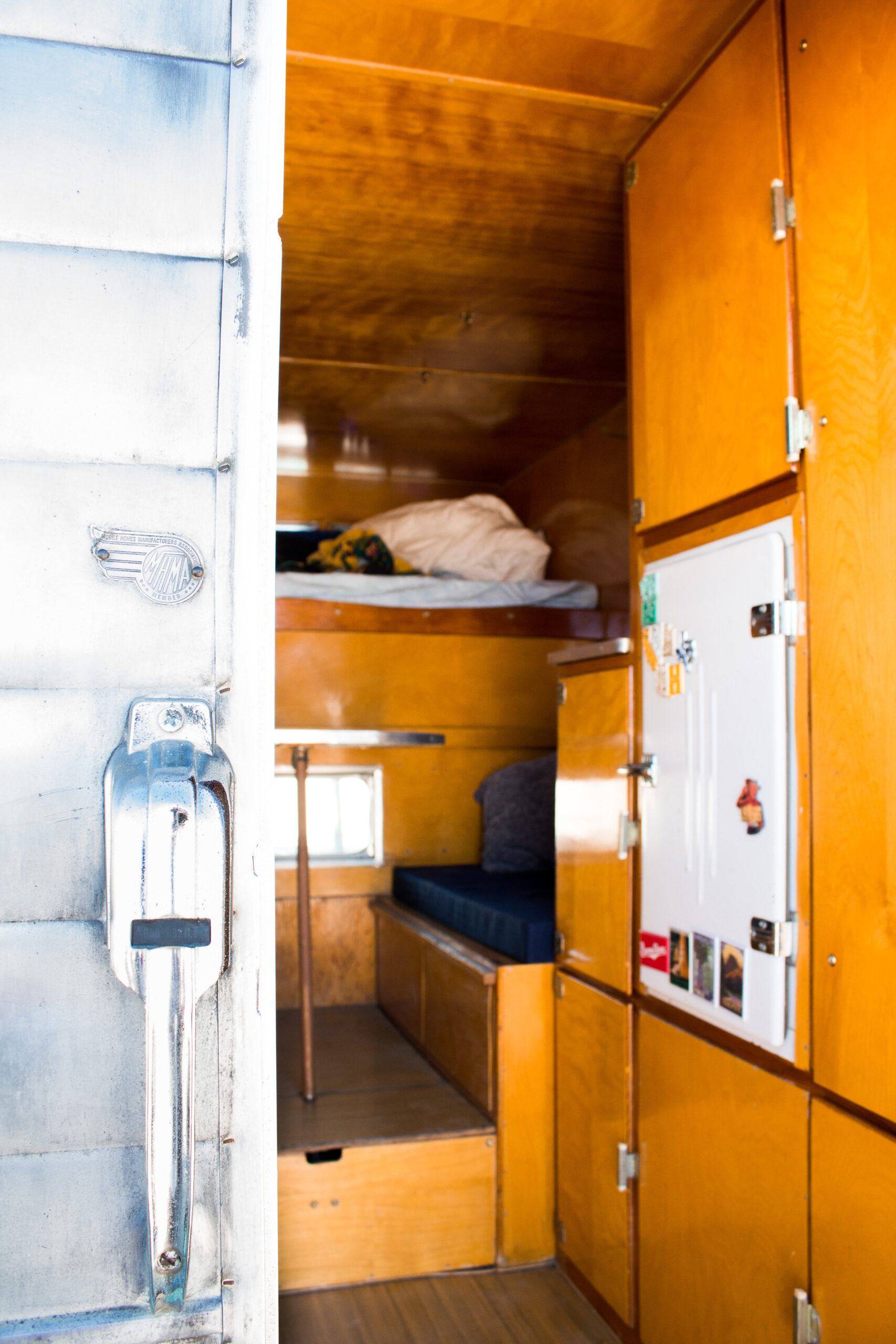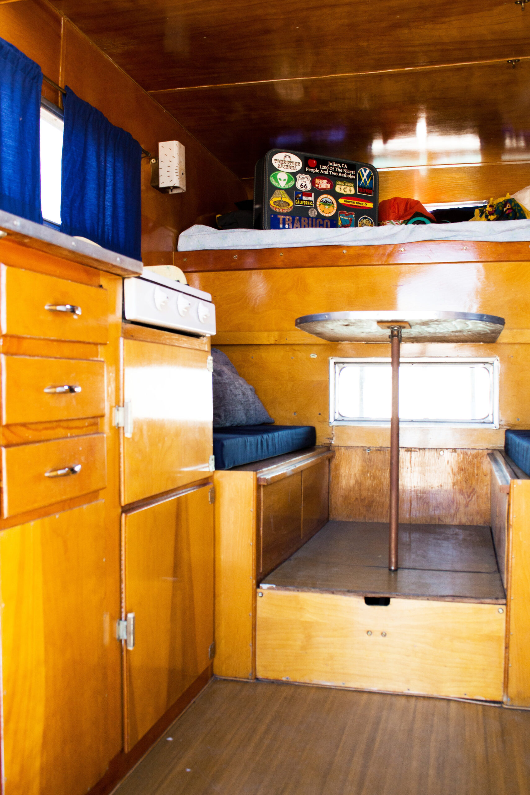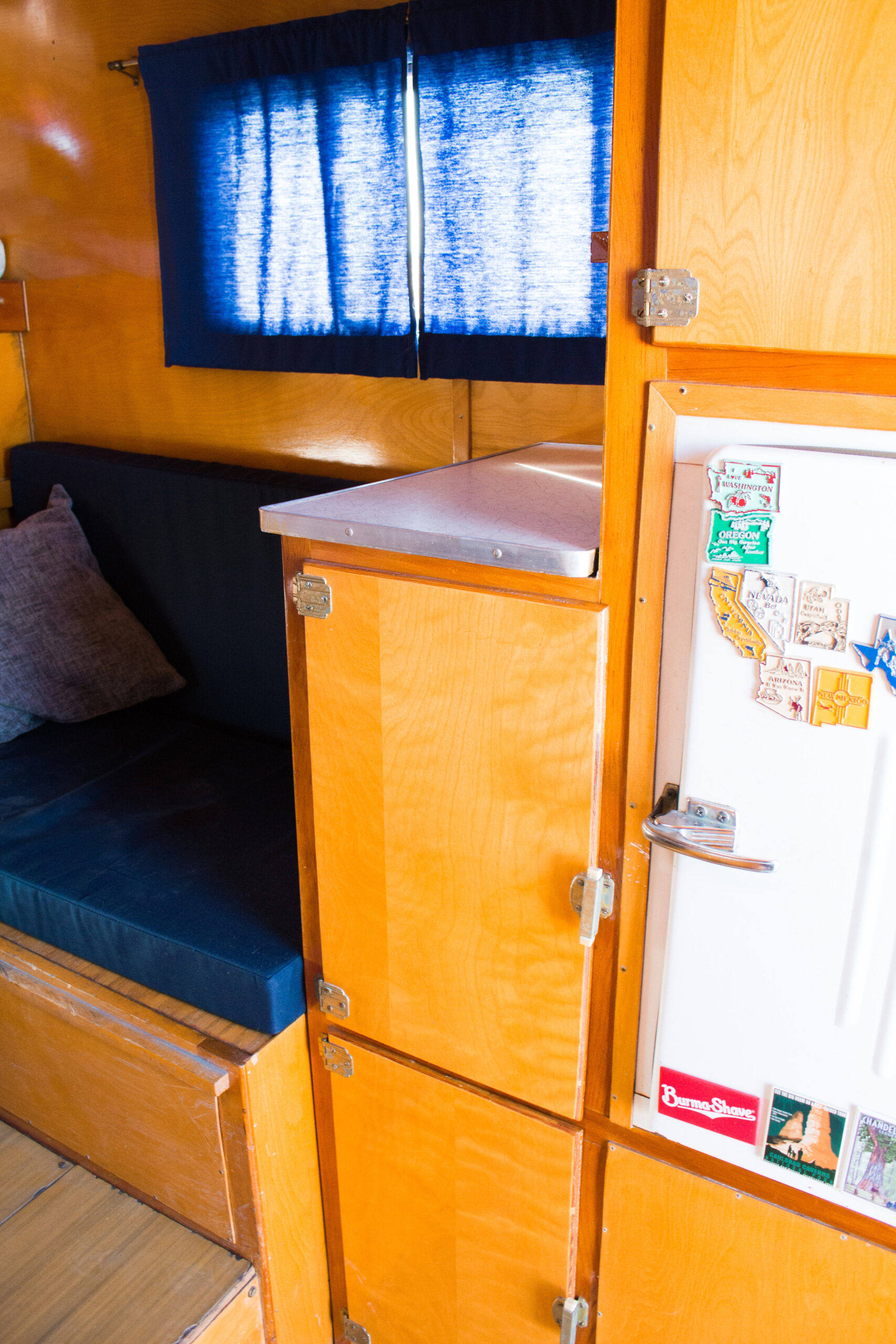 This Romer was in the best original condition of any camper I’ve bought, though it still needed attention. I went through all the wiring, pump, lines, hardware, seals, and reinforced the bottom wood. On the outside, I polished the aluminum and gave it fresh paint. Inside, I added new foam and fabric to make it comfortable again.