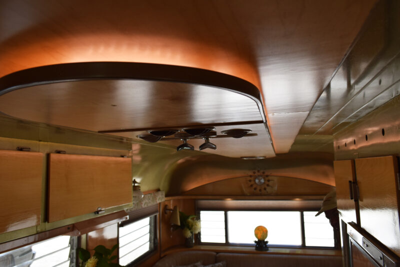 Gold-fleck automotive paint serves as the backdrop for the backlit wooden feature running the length of the ceiling, housing the controls for the roof-mounted air conditioning. The Jetsons-style “control center” in the kitchen looks straight out of the space age, though it was purely Craig’s imagination at work. The living area is anchored by a booth-style seating arrangement that hides the mechanism allowing the flat-screen TV to rise from the side table—a modern touch that disappears when not in use. You won’t want to miss seeing this inspiring trailer in person if you get the chance.