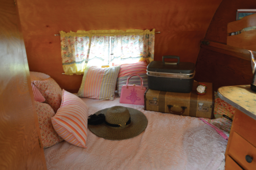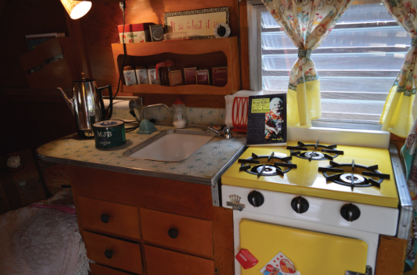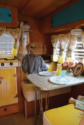 Hotrod owns a traditional barber shop called Hot Rod’s Chop Shop in Sacramento, CA and Rosy is a stylist at a beauty salon. These two creative people have decorated their 1959 Corvette trailer back to its original beauty with a few added extras to show off their personalities and make the trailer their own.