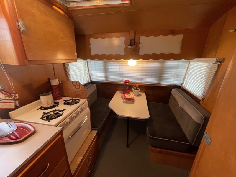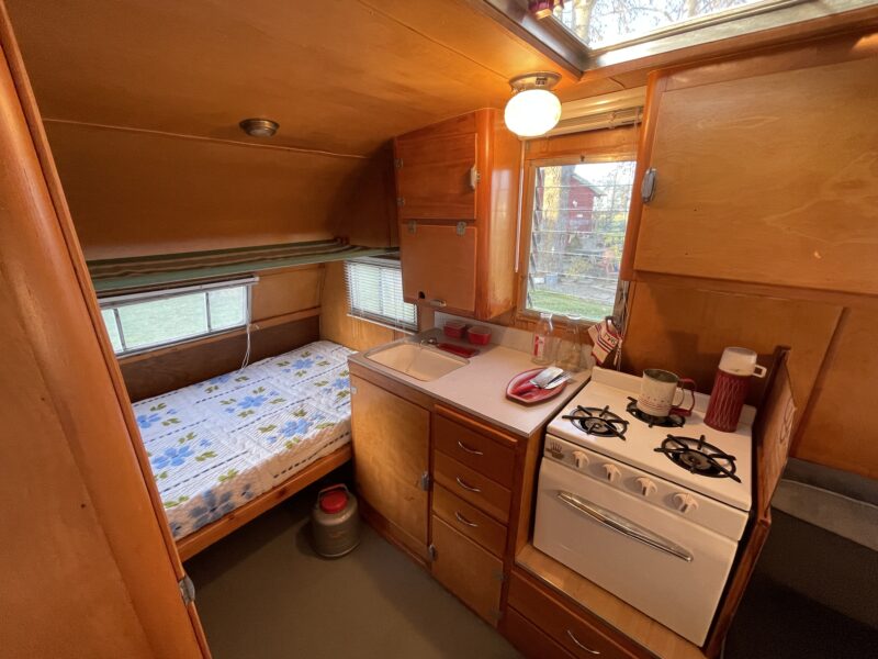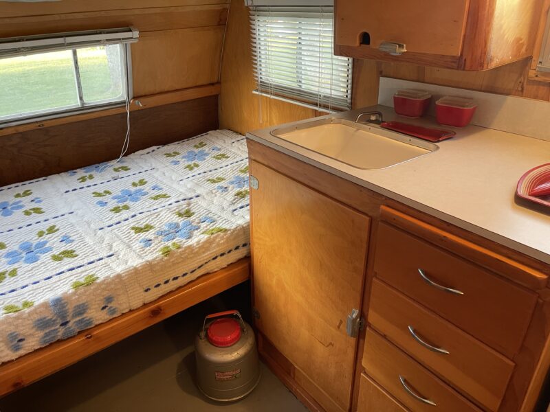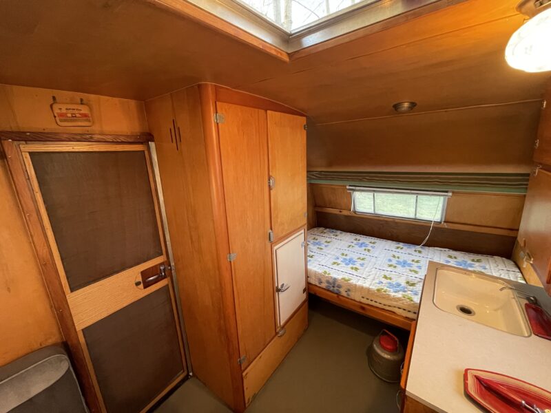 Inside, the layout is simple and practical, exactly as these trailers were designed to be in the 1950s. Much of the wood interior appears to be original and is still in good condition, giving the trailer a warm mid-century feel. Just as important, the interior is clean with none of the strange or musty odors that sometimes plague older campers.
