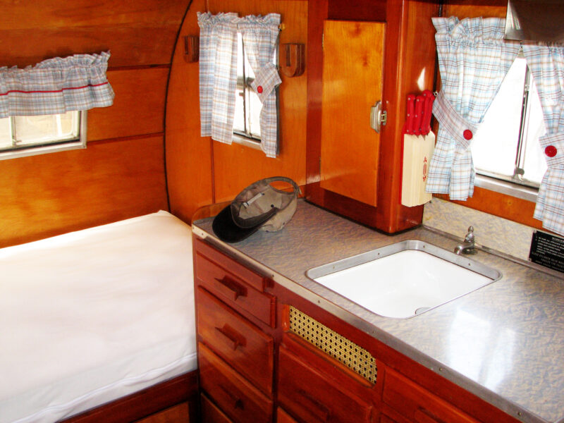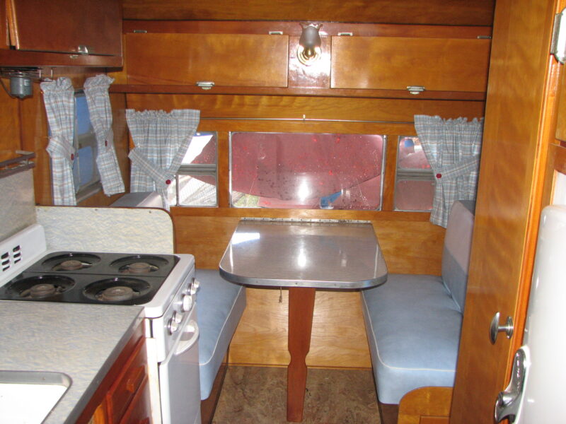 The restoration took place right in our driveway. We removed the siding and windows, polished the frames, added a couple of modern electrical outlets, and installed a small water tank with a hand pump for dry camping. Jim upgraded the tail lights for better visibility and rewired the signal system. Inside, we replaced a few lower wall panels, staining the new birch until it matched the old.