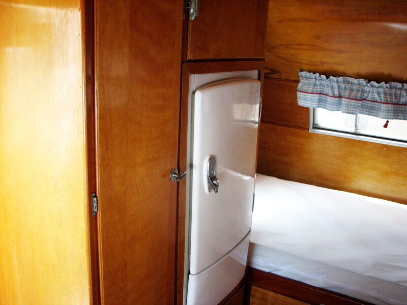 Once home, inspection revealed the kind of wear you’d expect after decades outdoors—some wood rot in the back corner and under the windows—but the floor and much of the structure were surprisingly solid. The original linoleum was still in great shape, and the Marvel refrigerator and Preway stove looked barely used. We even found the original awning, neatly folded in its box, and the factory inspection certificate still on the closet wall, which we preserved under plexiglass.