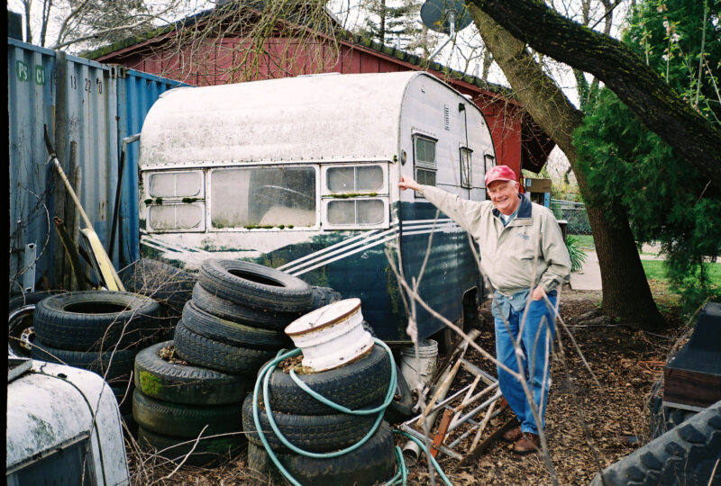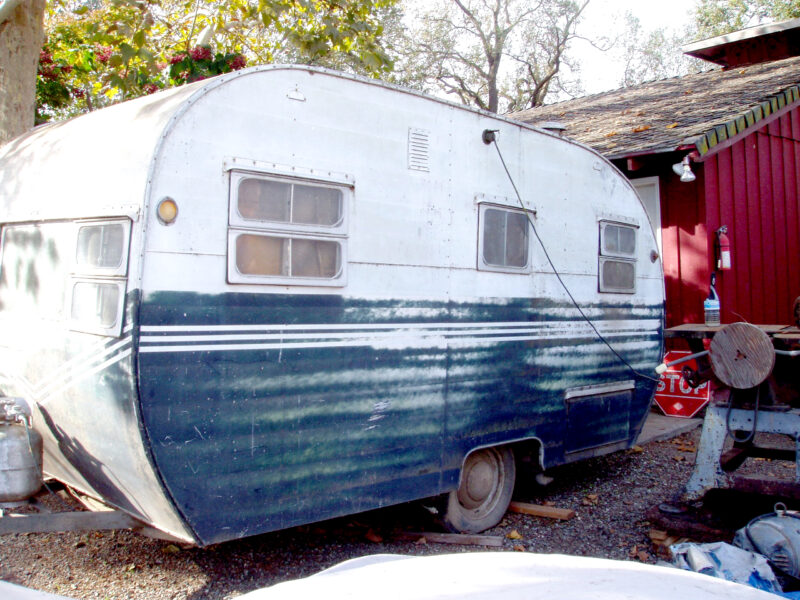 During the trip, we stayed with friends near Chico, California, and while visiting their property, Jim spotted something interesting behind a neighbor’s house—a weathered old trailer half-hidden among the weeds and tires. A quick inquiry revealed it was a 1953 Terry Rambler, last registered in the 1980s and parked there ever since.