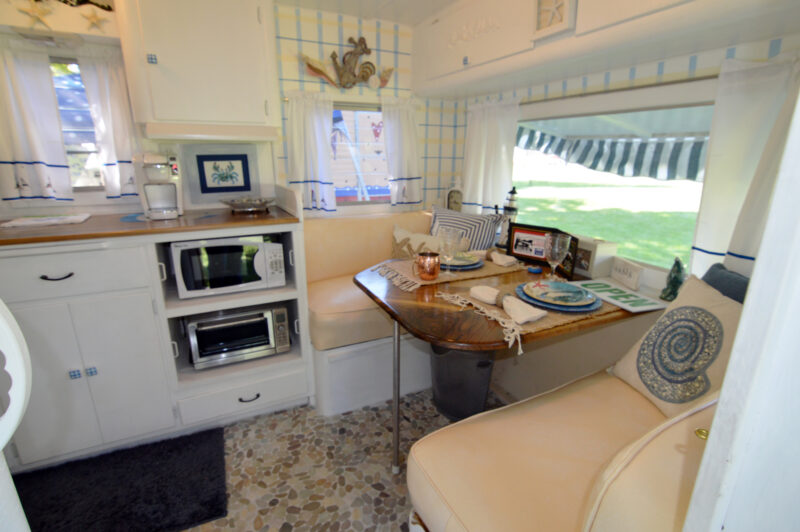 Inside, the trailer reflects Janet’s personality. What looks like wallpaper is actually hand-painted designs with a touch of glitter for sparkle. After visiting a local farm that was salvaging lumber, she fell in love with a slab of black walnut and knew it had to become her countertop. Ten coats of spar urethane later, it gleamed exactly the way she imagined.