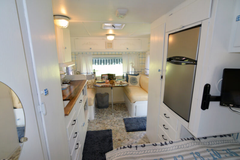 Janet isn’t afraid to get dirty, and she dove headfirst into the project. The restoration took two years, with a little help from friends and her husband. Once the aluminum skin came off, a friend stepped in to replace all the rotten wood. Her husband—luckily a retired electrician—rewired and plumbed the trailer, giving the Oasis a safe and solid foundation for the future.