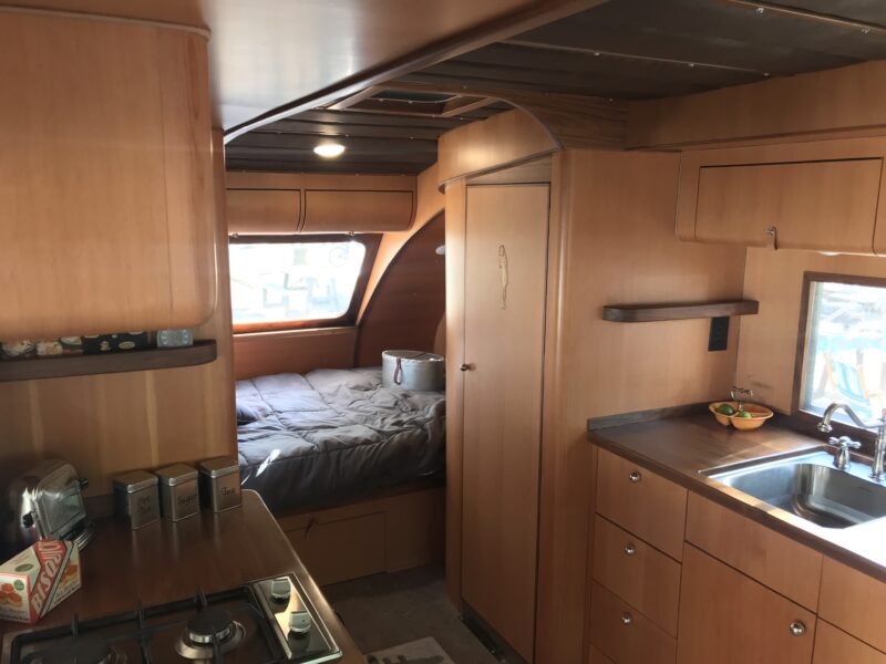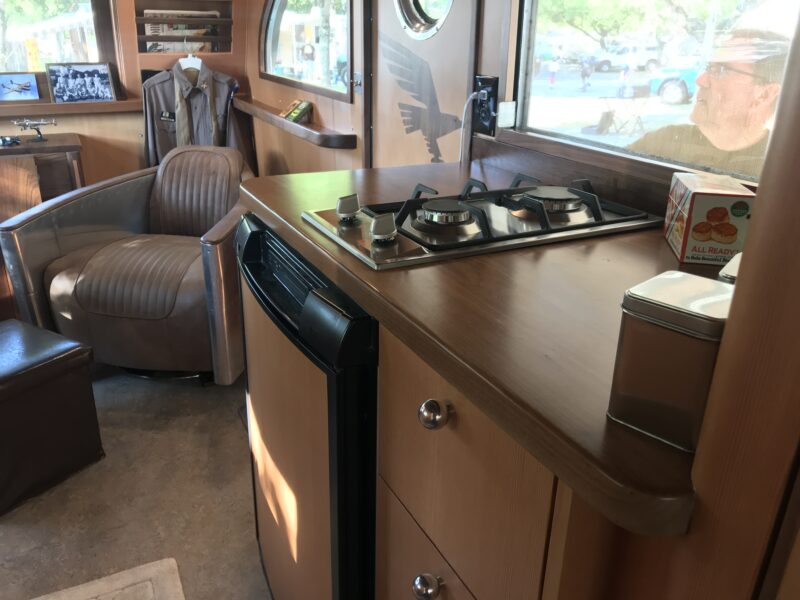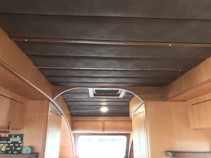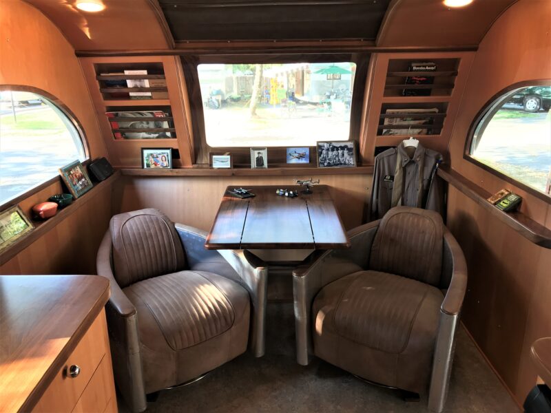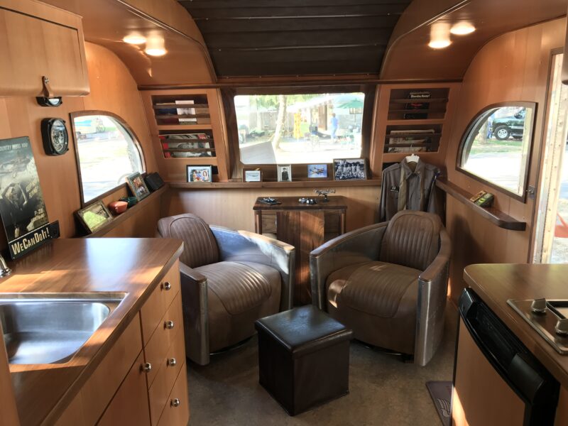 Inside, this particular trailer reflects the same spirit of thoughtful design and craftsmanship that defined its origins. The custom upholstered ceiling was intentionally designed to echo the material and look of the front swivel seats, creating a cohesive interior aesthetic. In fact, the seats were so substantial they had to be installed through the front panel during construction — a small detail that hints at the level of customization involved.