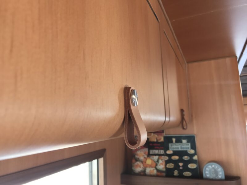 The cabinetry is finished with soft leather pulls that add warmth and texture. Radius corners are cut from solid vertical grain Douglas Fir, and the window frames are crafted from solid slabs of English Walnut — no joints, no shortcuts, just clean, confident woodworking.