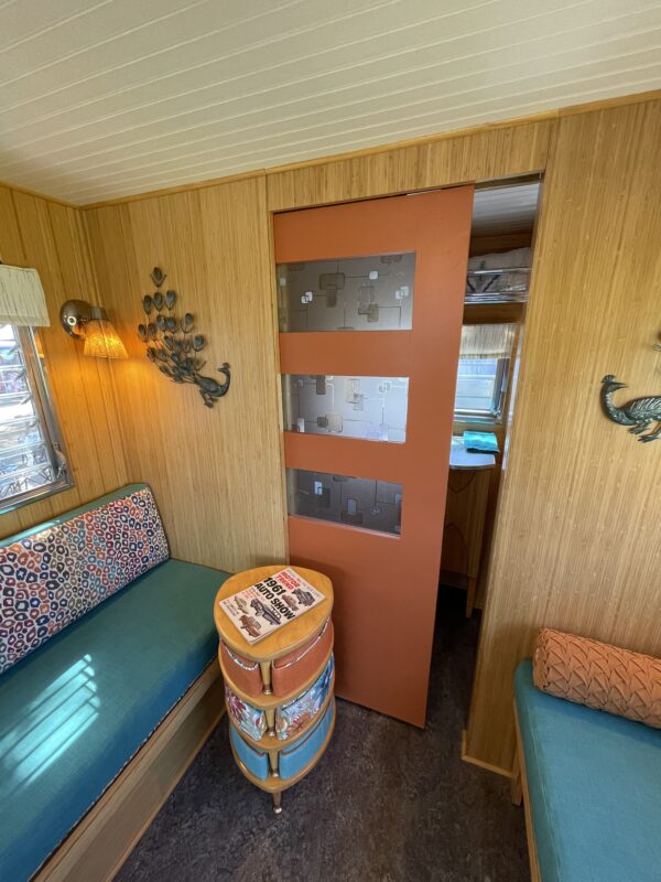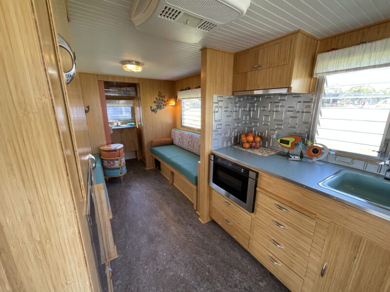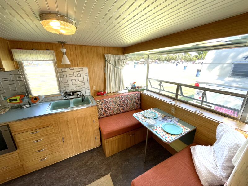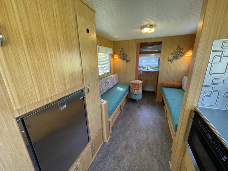 Rather than replicate the former trailer, this build became a fresh interpretation. Bamboo was selected for the interior walls and cabinetry, offering warmth, durability, and a sustainable twist on mid-century styling. The front dinette was refinished and reimagined with new bamboo plywood, while missing table hardware was thoughtfully sourced to preserve period authenticity.