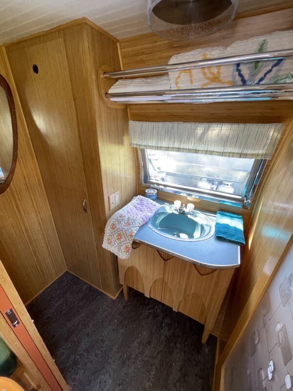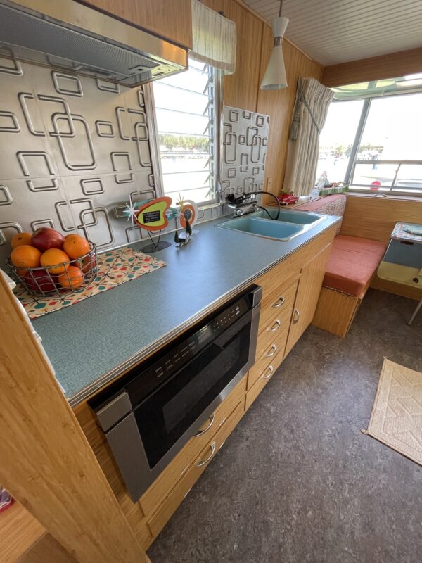 The galley reflects a smart blend of vintage style and modern convenience. A marine-grade IsoTherm AC/DC refrigerator — designed for boats — was installed, making it ideal for the movement and angles of travel. Compact, efficient, and even capable of making its own ice, it fits beautifully into the footprint of a classic trailer.