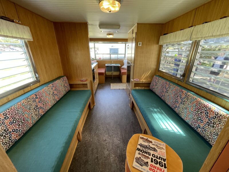 Vintage photos showed the trailer once housed a queen bed and dresser. Instead, this restoration opted for twin beds that double as lounge seating — perfect for hosting friends during rallies and offering easier nighttime access when needed.