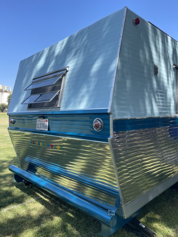 The distinctive curved front window was replaced with Lexan, and new Hehr-style window frames were fabricated to bring clarity and authenticity back to the façade. Replacement aluminum skins were sourced during a memorable trip to Hemet Valley RV, and the exterior was finished in a stunning blue that closely matches the original factory tone.