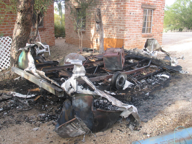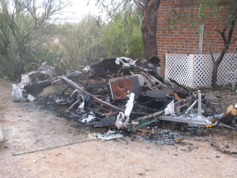 That evening, while preparing to stay in and watch the Arizona Wildcats, Nancy said, “I smell smoke.” Moments later she looked outside and shouted, “The trailer is on fire!” She quickly called 911, grabbed our cat Felix, and moved the El Camino while I tried—unsuccessfully—to battle the flames with a garden hose. The Fire Department arrived quickly and worked to contain the fire, but in the end, our little Shasta was gone.