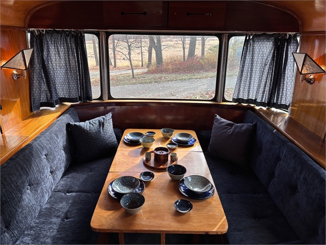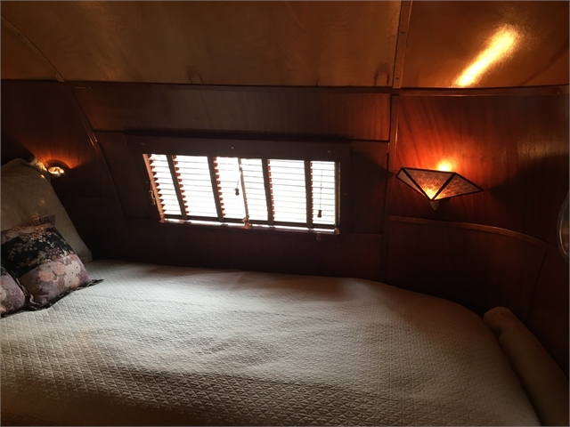 The restoration honored the trailer’s historic materials and layout. Original woodwork was refinished wherever possible, with select replacements done in kind. Mahogany lines the observation lounge and bedroom, while birch was retained in the kitchen and ceilings. Cabinets and closets were rebuilt and refinished, original hardware was cleaned and re-chromed, aluminum counters polished, and original windows, locks, lights, vents, and fixtures restored to working order. Even the awning, screen doors, and dining table remain true to the trailer’s original character. The exterior aluminum has been polished multiple times over the years, most recently by professionals, and the floor was finished with Marmoleum in a historically appropriate pattern.
