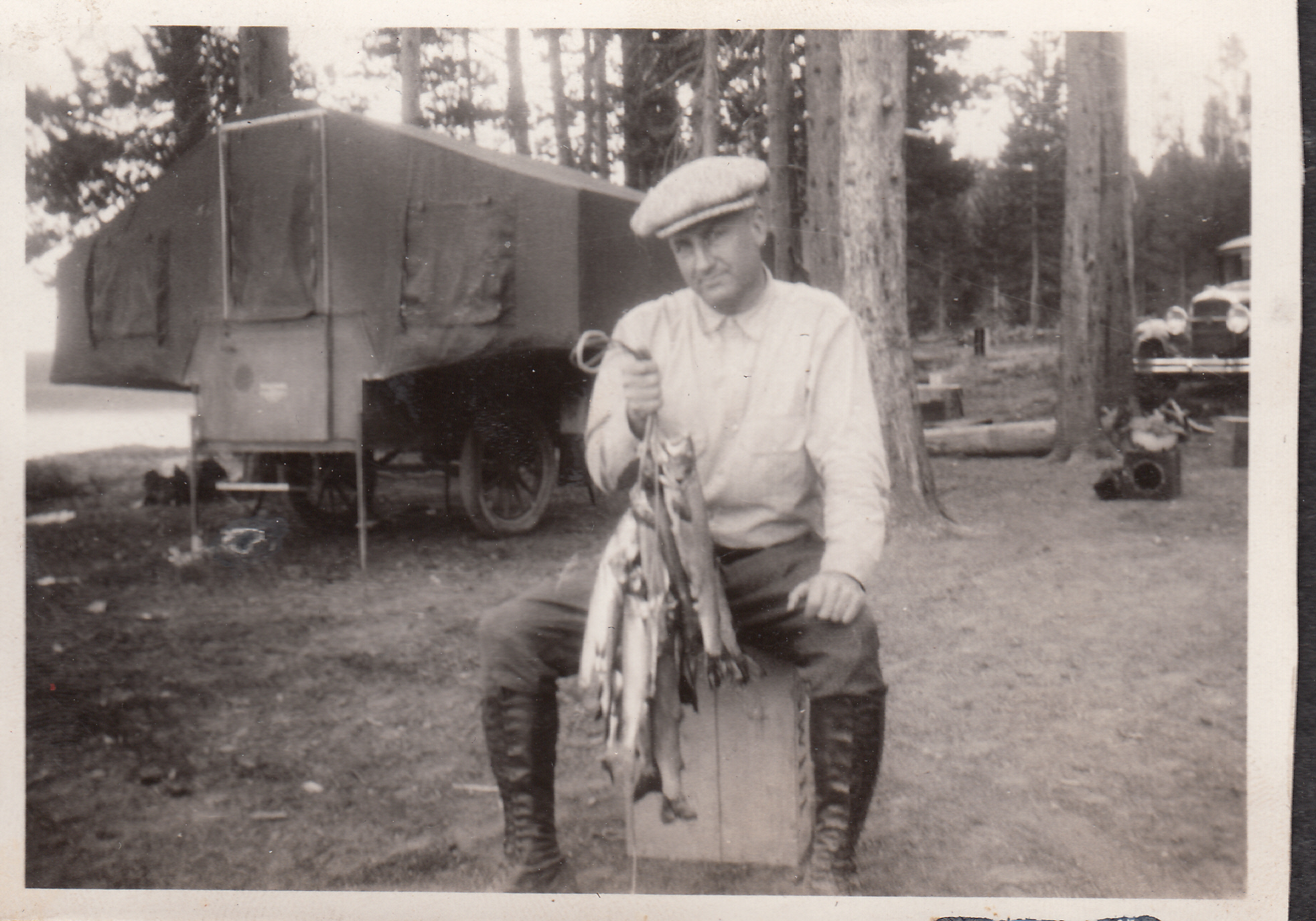 The photos are named: Yellowstone camping ca.1929. Dick Sr & Gilkie trailer