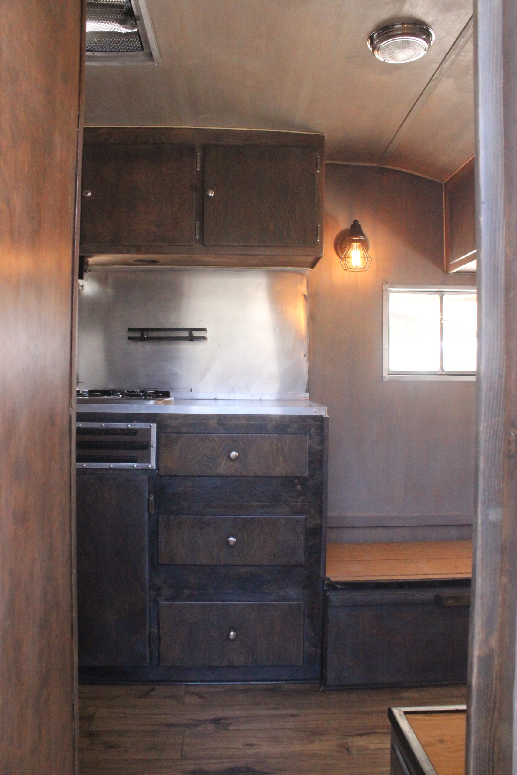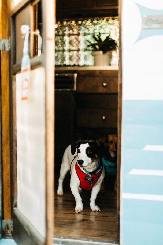 Originally, I thought I’d find the perfect already-restored trailer, but I quickly discovered just how rare (and pricey) those can be. Then I came across a restoration team who showed me the Fleetwood. Even in its decrepit state, I knew it was the one. Together, we designed my dream trailer: rebuilt with safety in mind, modern touches for comfort, and charming details that honored its history—like original iron vent grates and even a custom pet feeding station for my two travel companions.
