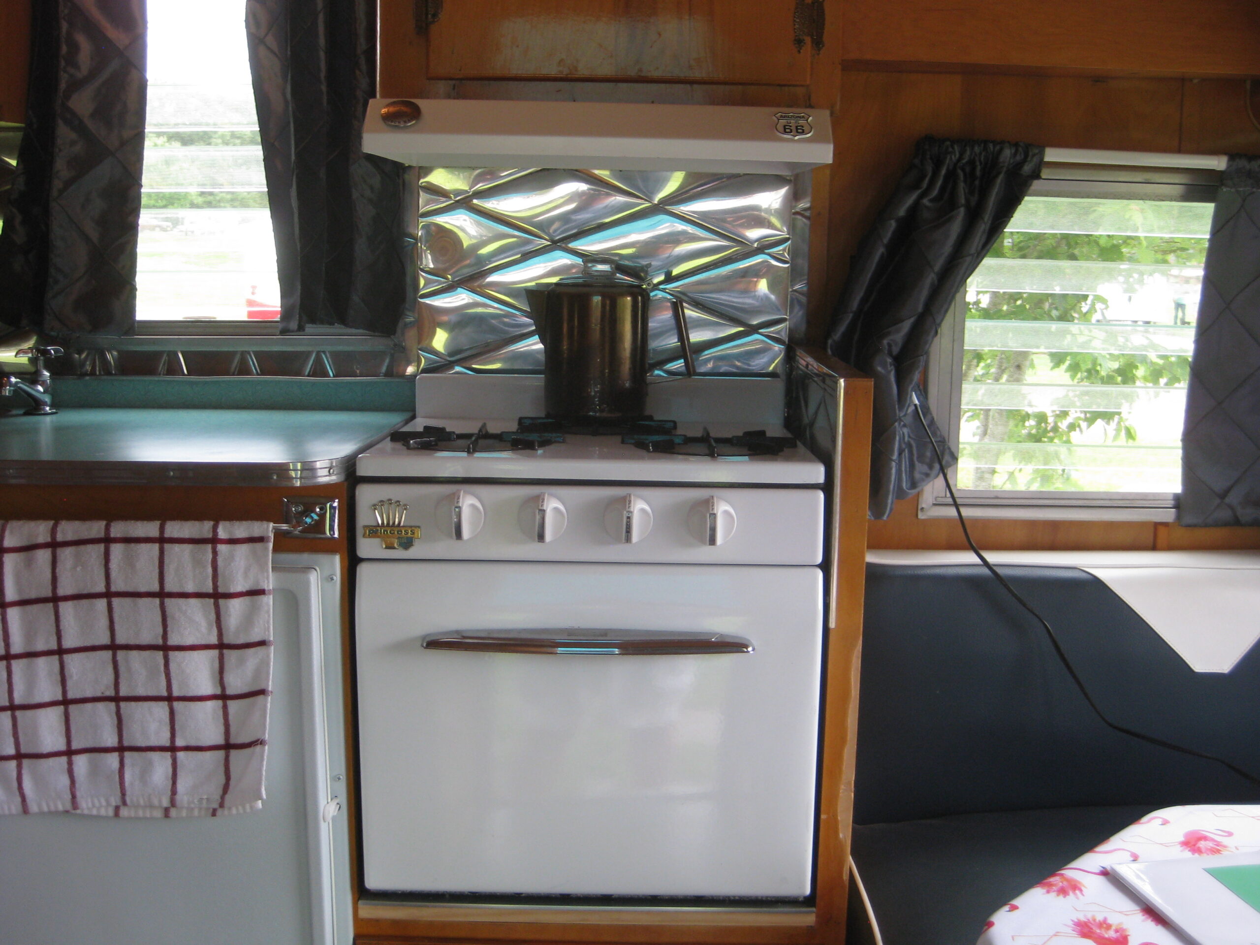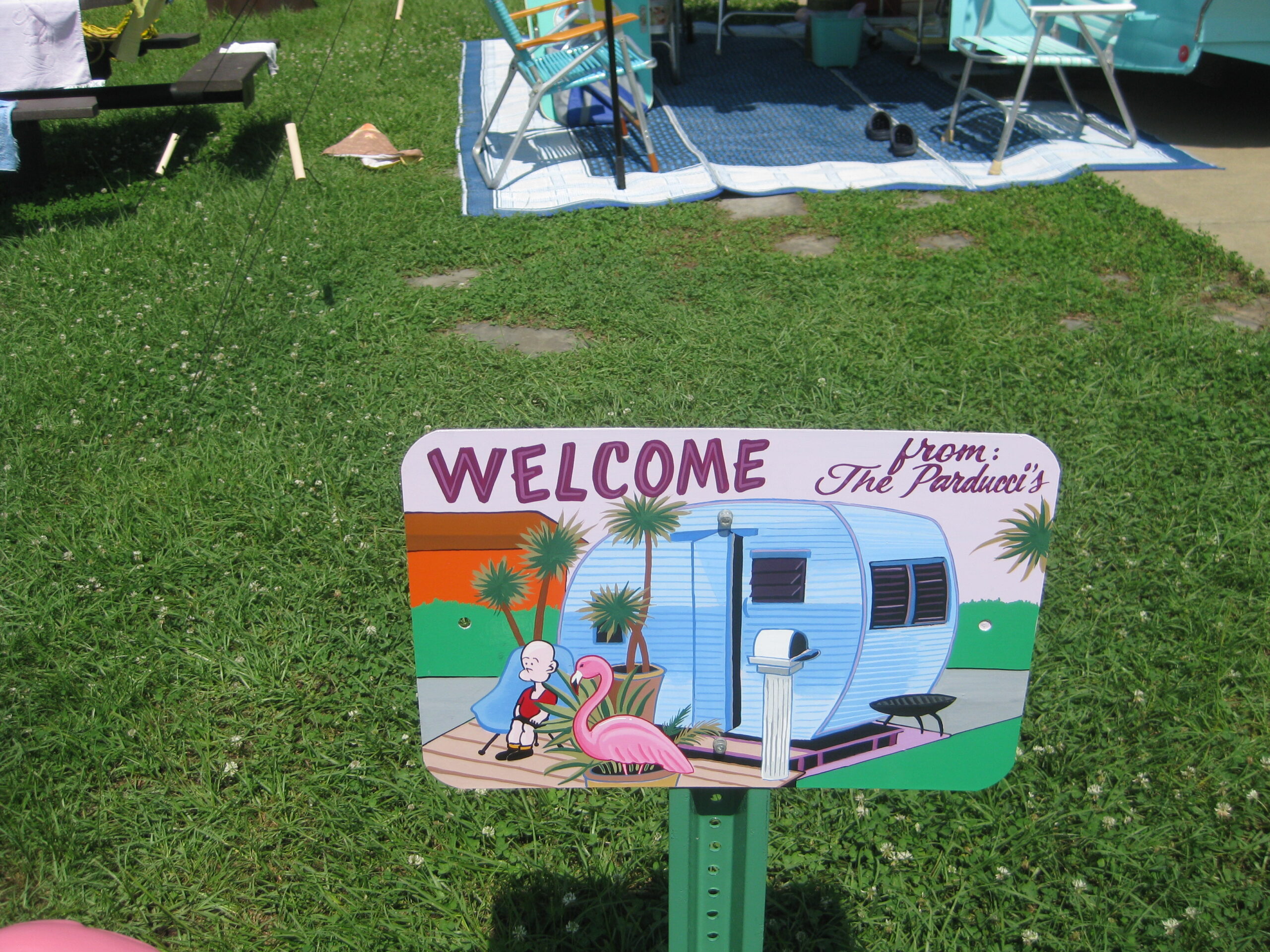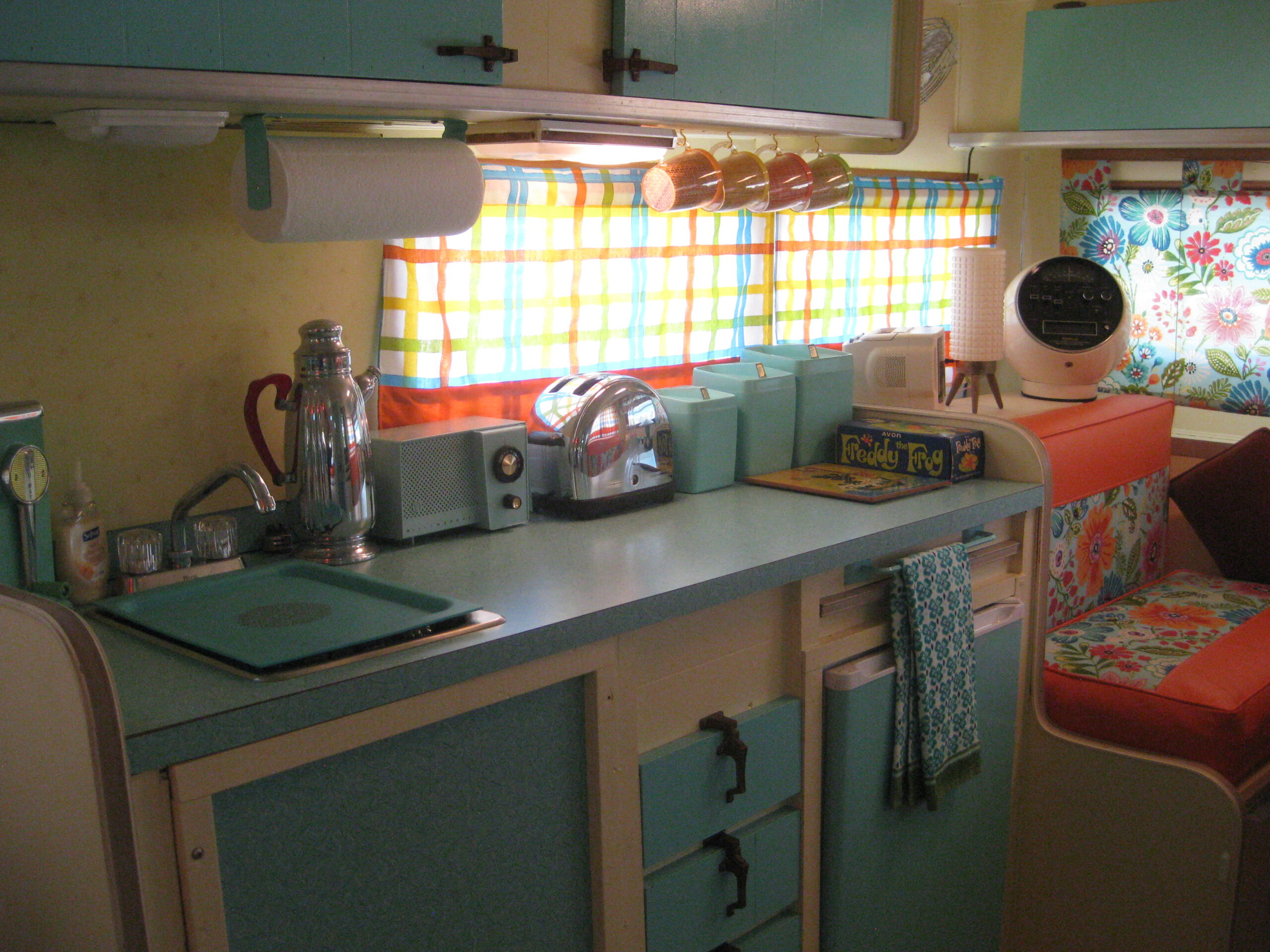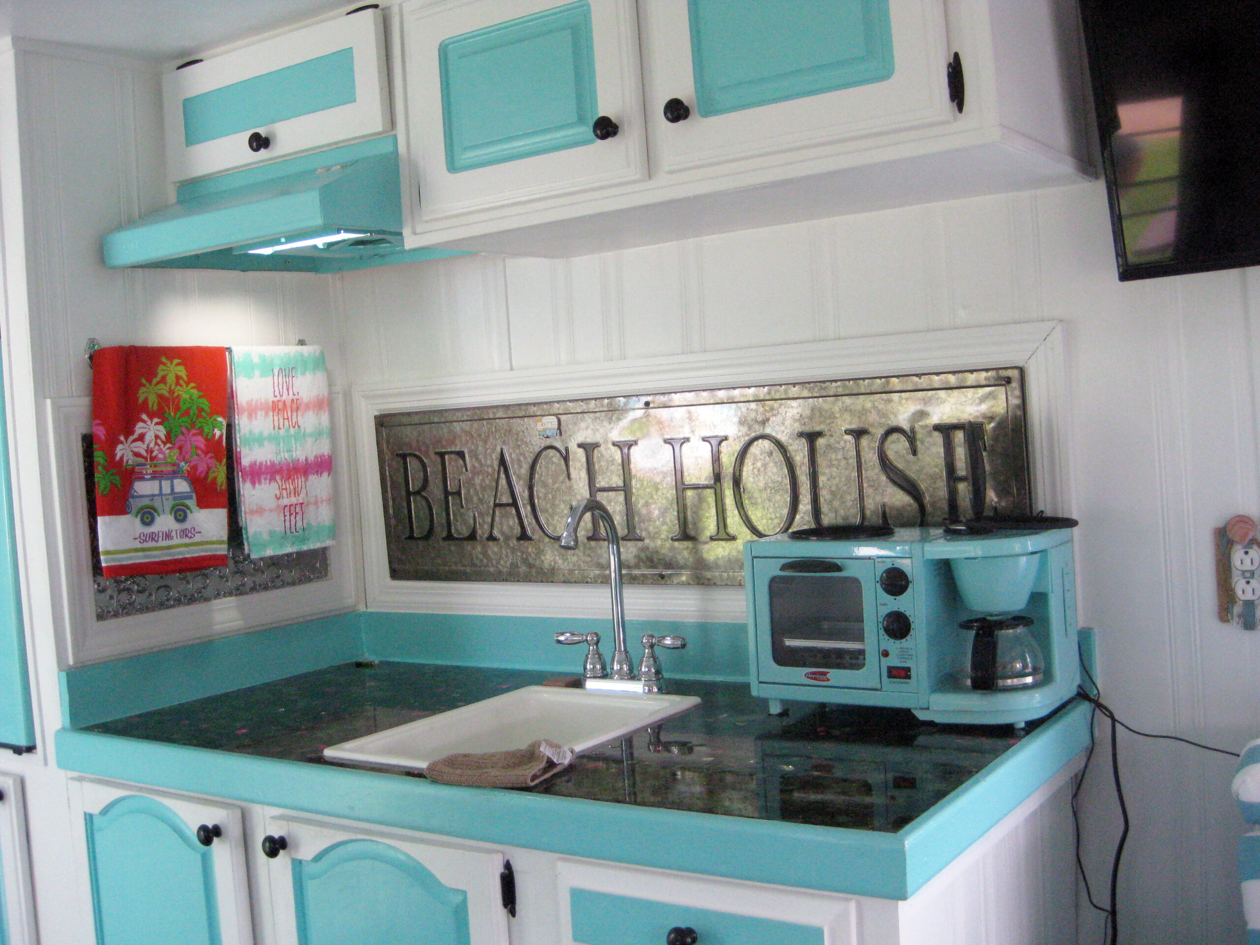 Once home in Alabama, Wayne refreshed the Travel Mate with a cheerful turquoise-and-white exterior and carried the color scheme inside. He and his wife, Valerie, filled the space with vintage décor and personal touches, including a hand-painted welcome sign that sets the tone for their nostalgic setup.