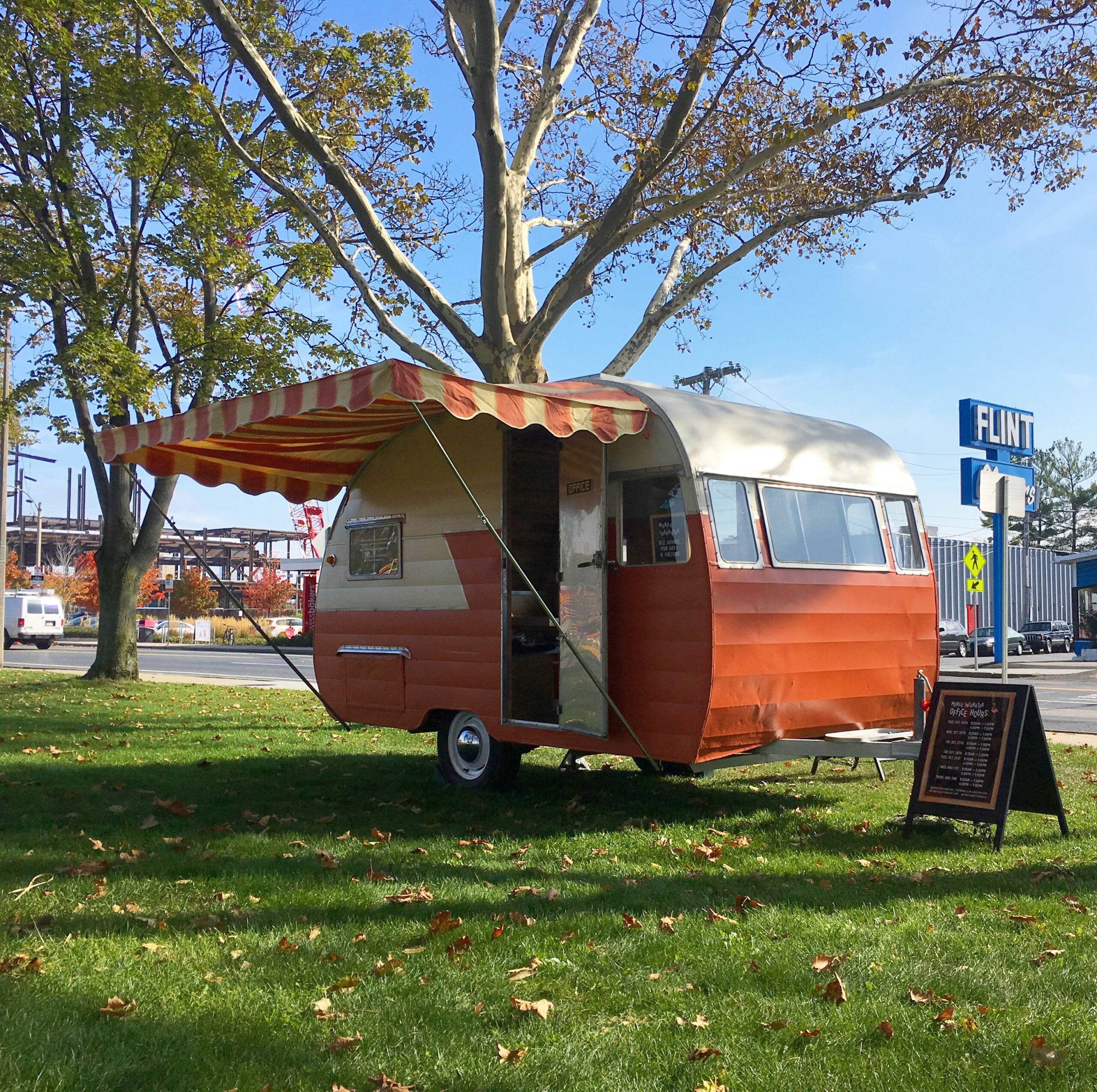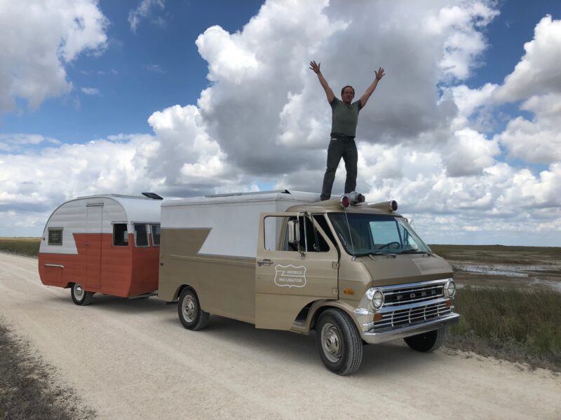 The Original Mobile Incubator was a showcase of American creative enterprise. The structure was a completely overhauled 1957 Shasta camper, an American icon of industrial design by Robert Gray. During the height of the “canned ham” era—from the 1940s through the 1970s—Shasta sold more trailers than any other manufacturer, and its signature lightning stripe became so iconic it was widely copied by numerous SOBs (Some Other Brands).