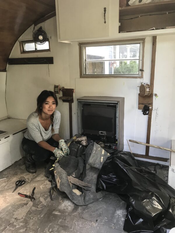 When I first saw the Lil Hotdish, it was far from love at first sight. I found it while scrolling through my Craigslist this past fall. I was actually looking for a fish house for ice fishing on our Minnesota lakes in the winter. This one happened to be a vintage camper that was converted to a fish house so it would work for all four seasons. You could call it a “vintage fish house camper.” It looked very shabby – and not the shabby chic kind of shabby. A matte grey painted exterior with dents, broken windows, and plenty of water damage. But I saw the potential and so did my husband Nick. It would also make a great little sidekick to my Instagram and blog Girl of 10,000 Lakes which is dedicated to inspiring folks, especially women, to get outdoors. We had to have it.