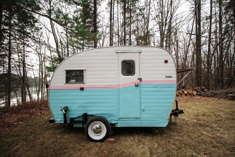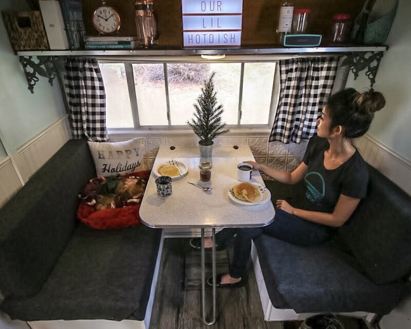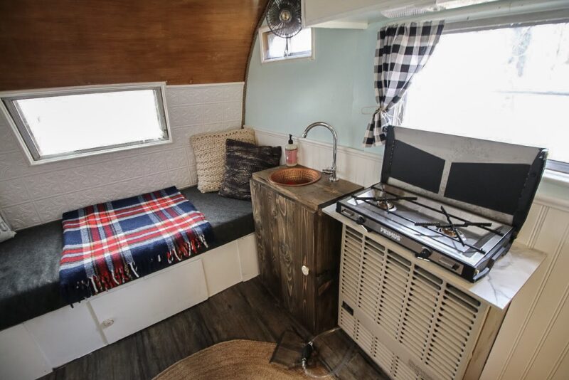We did a $1000 DIY renovation to get it back into shape. Some updates include new luan boards, a copper foot pump sink which now covers one of the fish holes, wainscoting and faux tin walls, new floorboards and laminate flooring, fresh coat of exterior and interior paint, and a cooktop area for our Primus Tupike camping stove. There were definitely issues we had to fix, like the carpenter ants and wood rot. I still have goosebumps thinking about that. We patched up holes on the outside, fixed the brake lights, heater and windows, etc. We kept the original ceiling, cupboards, seating, table, and gas lamps. In the end, Nick and I decided the camper needed a super Minnesotan name. It was between the Minisota and the Lil Hotdish. Nick and I both agreed the Lil Hotdish was the clear winner, especially since I planned to cook up some hotdishes (some people call them casseroles) in the camper.