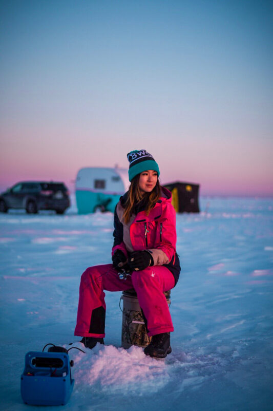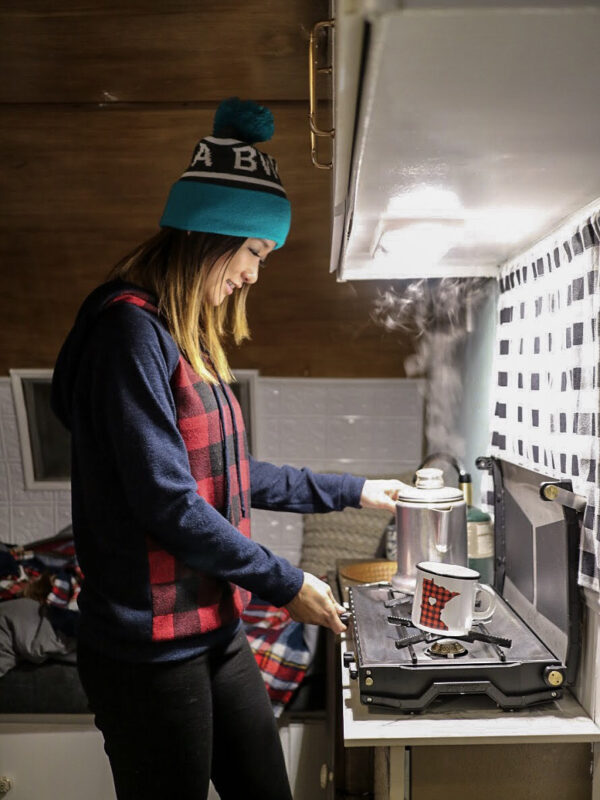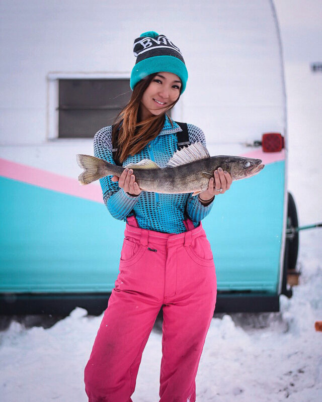 Our friends always ask, “how do you stay warm when it’s -10 degrees outside?!” It’s called a heater, folks. Thankfully, ours works really well and it gets toasty in no time. One propane tank can last us three days. My favorite part of the Lil Hotdish, besides being able to ice fish, is the camaraderie it provides. It’s a comfortable little space for sharing a meal together, drinking wine, playing card games, listening to tunes, and simply catching up on life while surrounded by a beautiful winter wonderland. It’s efficient to be able to sleep on the ice in the camper instead of going back to a hotel, which is what we used to do. Before the Lil Hotdish, our fish house was a pop-up shanty or basically a tent. Now, we wake up in the luxury of the camper, make french press coffee in the morning, and cook up some chocolate chip pancakes for breakfast.