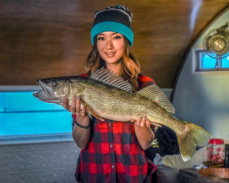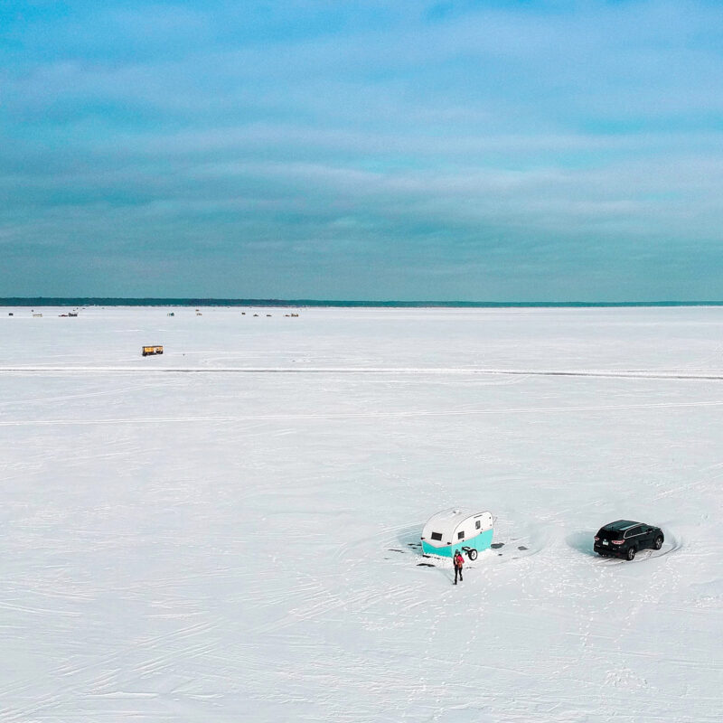 This is the first winter Kiwi (our yorkie), Nick, and I took the Lil Hotdish out onto the ice. With the camper hitched on our SUV, we’ve rolled onto the ice roads of Mille Lacs Lake nearly every wintry weekend now. Mille Lacs is known for premium walleye and bass fishing. The ice is around 27″ thick, which is more than enough for driving an SUV and towing a camper. Once the camper is unhitched, it’s a process that I now know like the back of my hand: lower the crank down mechanism, hook up the propane to get the heater going, grab the auger and drill holes in the camper, setup the rattle reels with bait and put the line in the water, and transform the Lil Hotdish from travel-mode to hygge-mode. In case you haven’t heard of a rattle reel, it’s a fishing reel that’s attached to the wall of the camper right above the ice fishing holes. Place a minnow on the hook and lower the line down into the water until it’s hovering a foot or two from the bottom (that’s where the walleyes are). It allows us to fish while we are sleeping since the reel starts rattling when a fish is hooked. It’s the best kind of alarm clock to wake up to.