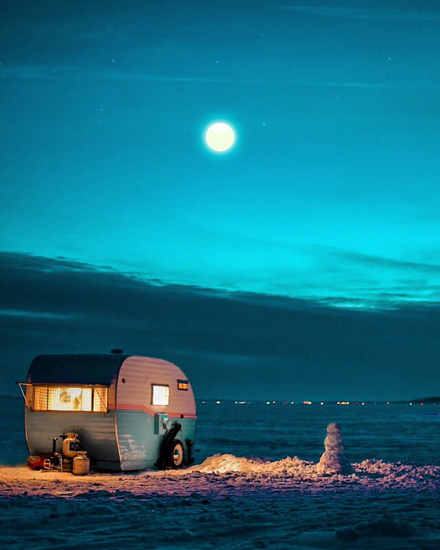 We get a lot of looks from other anglers who drive past the Lil Hotdish on the lake. We’ve even had people knock on the door randomly out of curiosity. There are fish houses scattered all across the lake, called “shanty towns.” But most fish houses are either home built or super modern. Our Lil Hotdish is definitely unique. It has vintage charm with the comforts of home.
