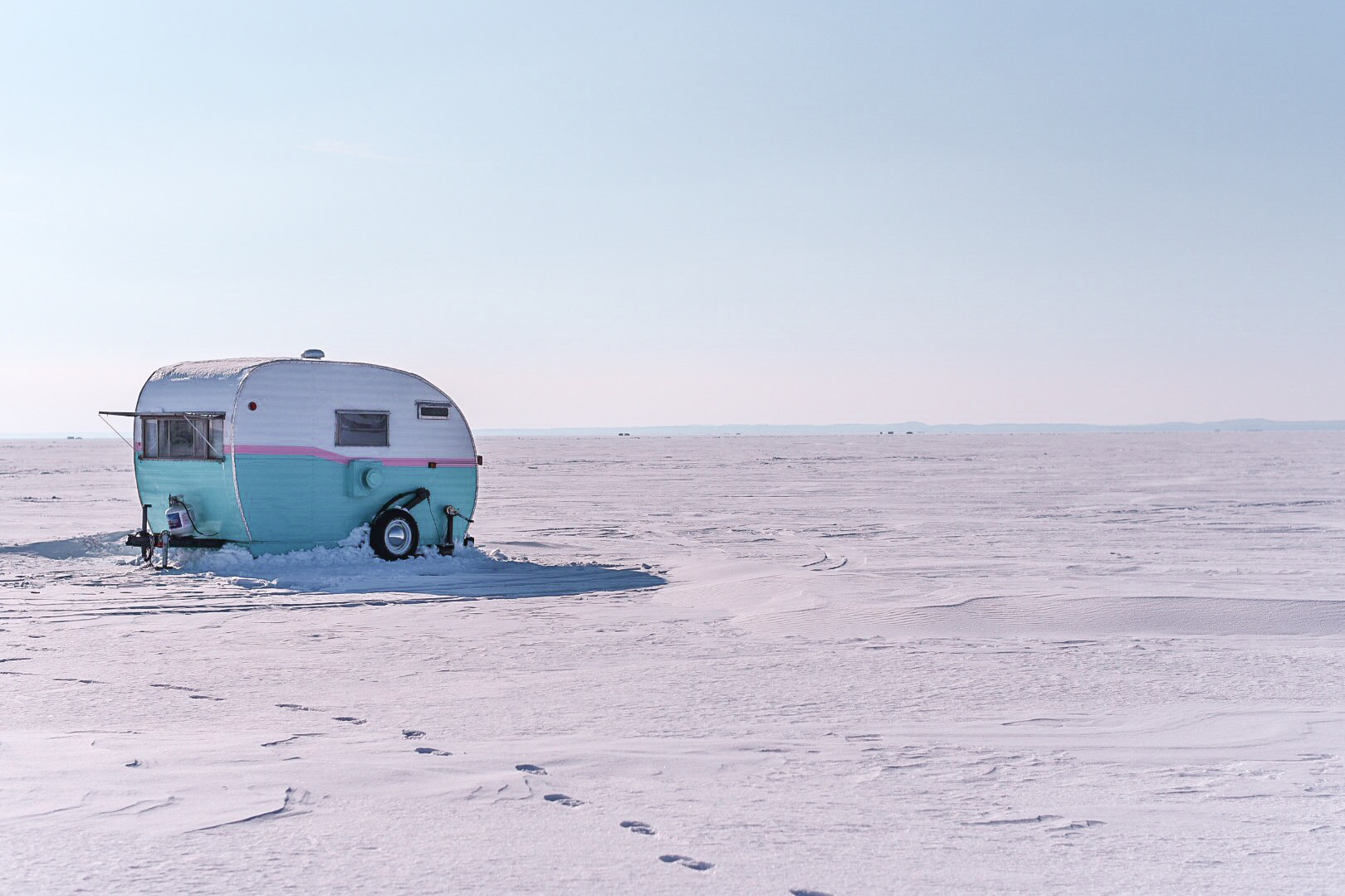 Our friends always ask, “how do you stay warm when it’s -10 degrees outside?!” It’s called a heater, folks. Thankfully, ours works really well and it gets toasty in no time. One propane tank can last us three days. My favorite part of the Lil Hotdish, besides being able to ice fish, is the camaraderie it provides. It’s a comfortable little space for sharing a meal together, drinking wine, playing card games, listening to tunes, and simply catching up on life while surrounded by a beautiful winter wonderland. It’s efficient to be able to sleep on the ice in the camper instead of going back to a hotel, which is what we used to do. Before the Lil Hotdish, our fish house was a pop-up shanty or basically a tent. Now, we wake up in the luxury of the camper, make french press coffee in the morning, and cook up some chocolate chip pancakes for breakfast.