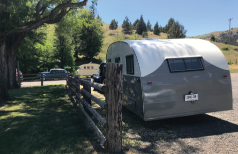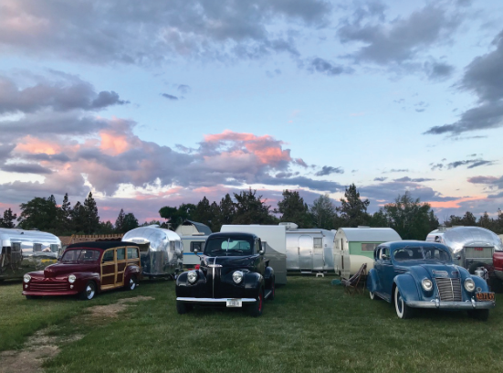 Chuck MIltenberger’s 1936 Airstream Silver Cloud (wood/masonite) in the background at Wilson Ranches Retreat in Fossil, Oregon.