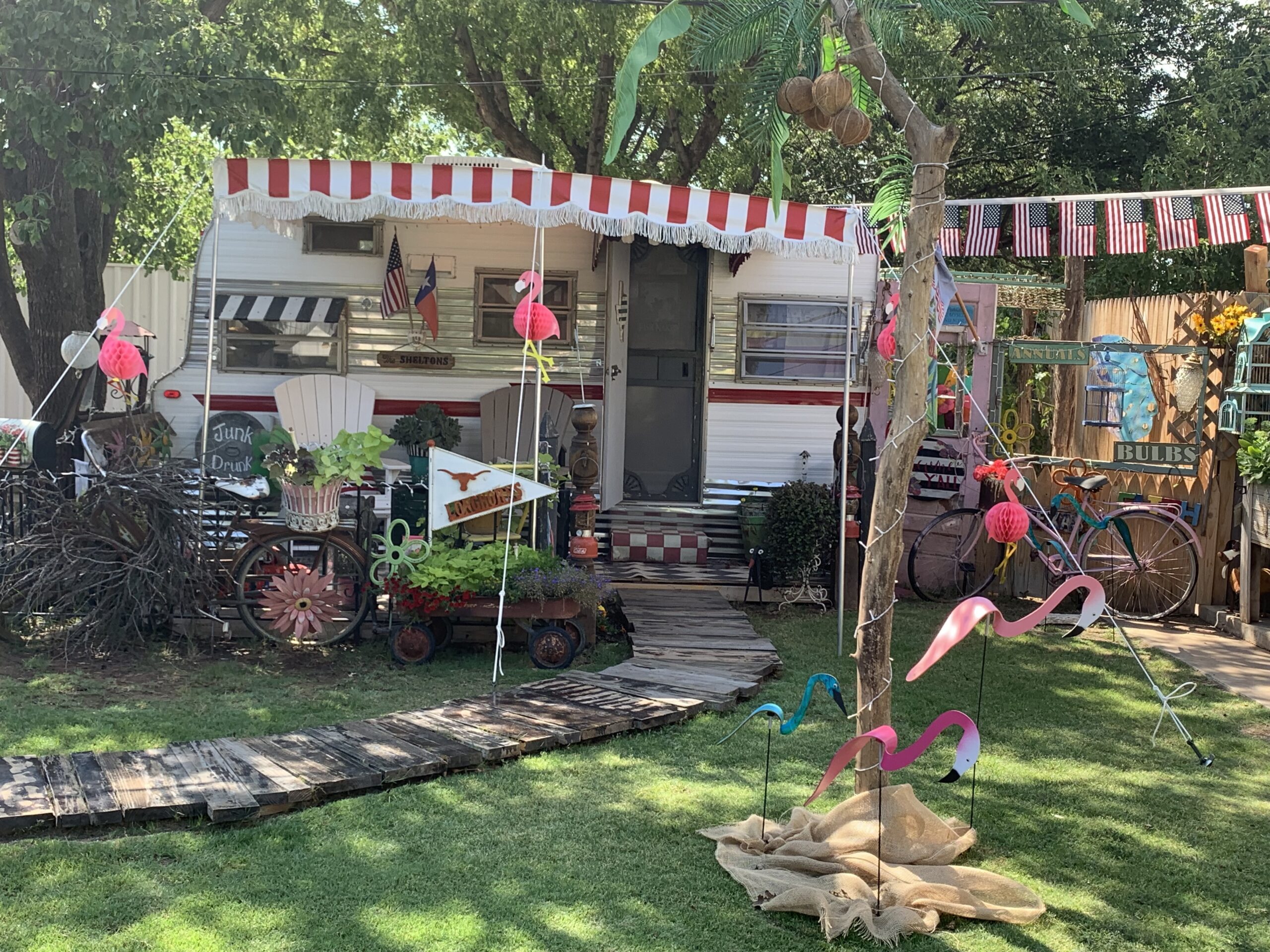 It was almost perfect, but it needed a few more things. We made a deck out of used pallets and fenced it with old iron fence sections we had acquired along the way. I decorated the yard area with flowers, bicycles, lights, and other odds and ends that found their perfect place in my own personal campground. I had my husband hang awnings over a couple of windows. I decorated the shower with a pin-up girl shower curtain and added several other little things that gave my Scout a new pulse.