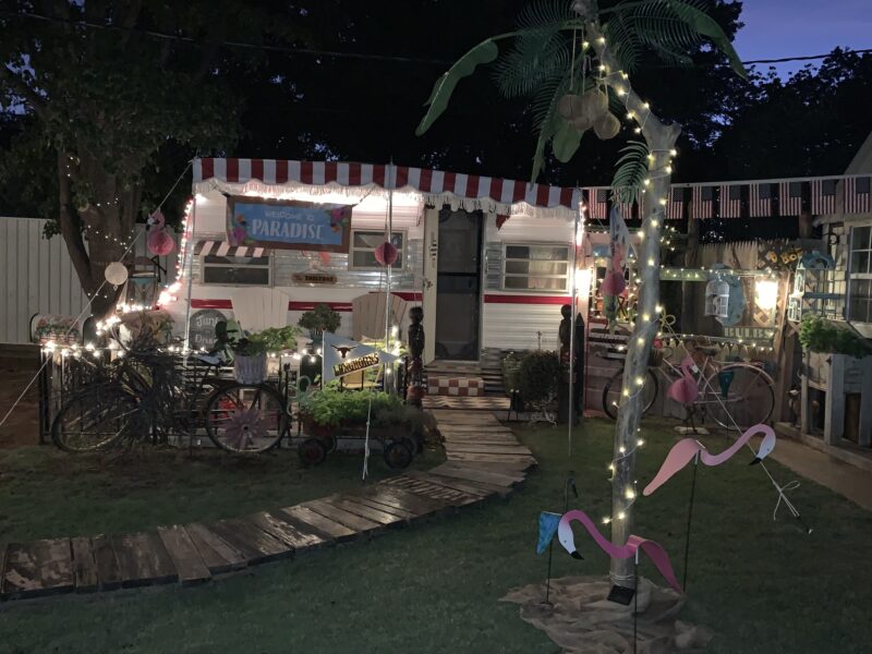 I had to do some sweet-talking persuasion to get my husband to see my vision with as much enthusiasm as I did. My cute little camper was about to go on its first trip—to the backyard. Not a long journey, but there were several obstacles to overcome. We had to remove part of a chain-link fence, part of a metal fence, jump a curb, and navigate around a tree and a storage building to get it into an almost perfect spot. Then there was the debate over whether to leave the tree or cut it down, but it ended up staying right where it was to shade my she shed.