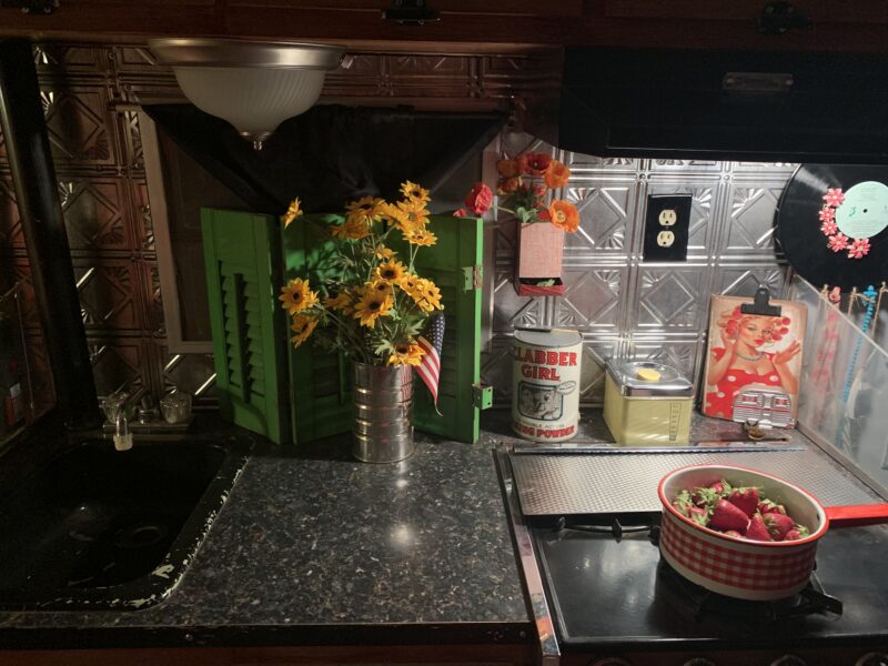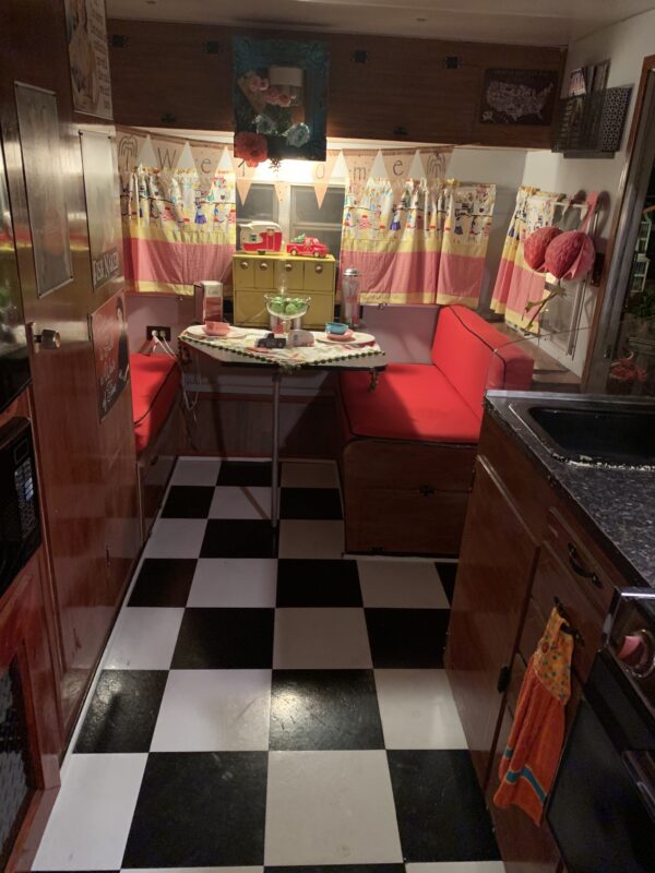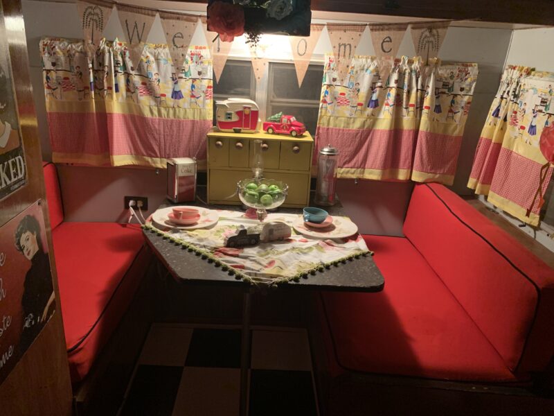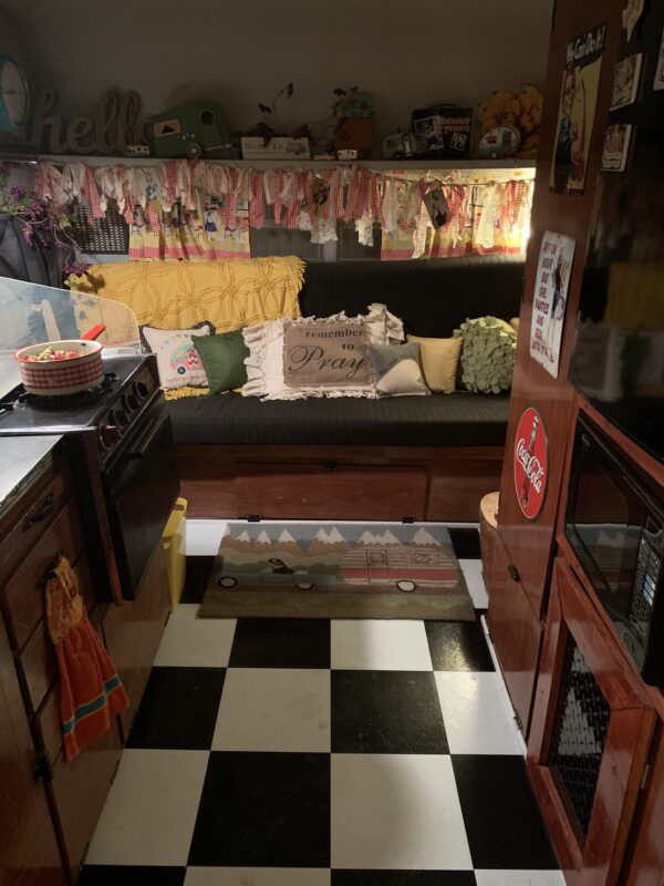 I had the perfect camper for me and was excited to show it off. My husband made a few changes by adding some paint, installing black-and-white laminate tile, a faux-metal backsplash, and building a new screen door. I brought life to the inside with a few of my older collectibles. There was, and still is, a lot of fun in looking for the perfect knickknack at antique stores, friends’ barns and garages, and garage sales. One of my friends made some of the cutest curtains to dress up the windows.