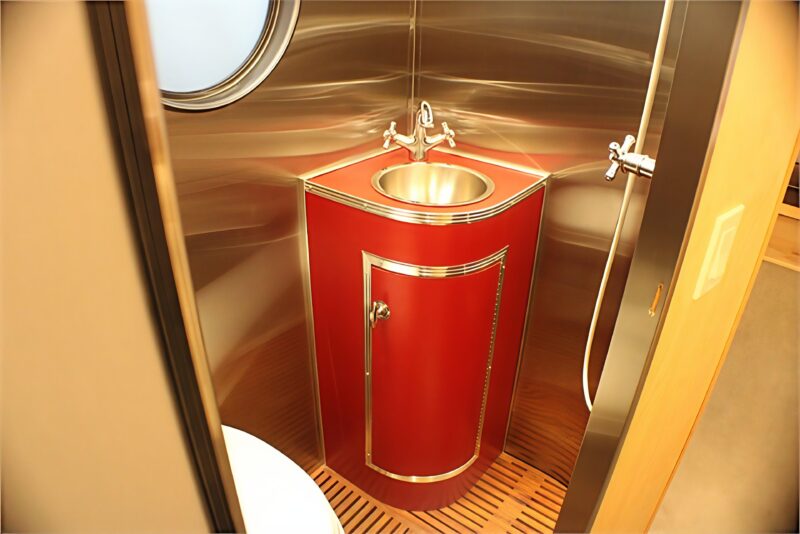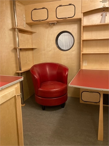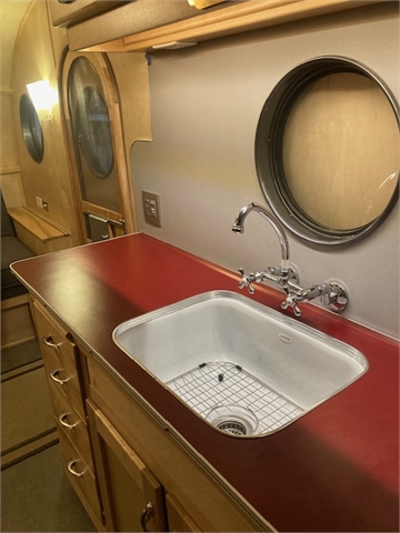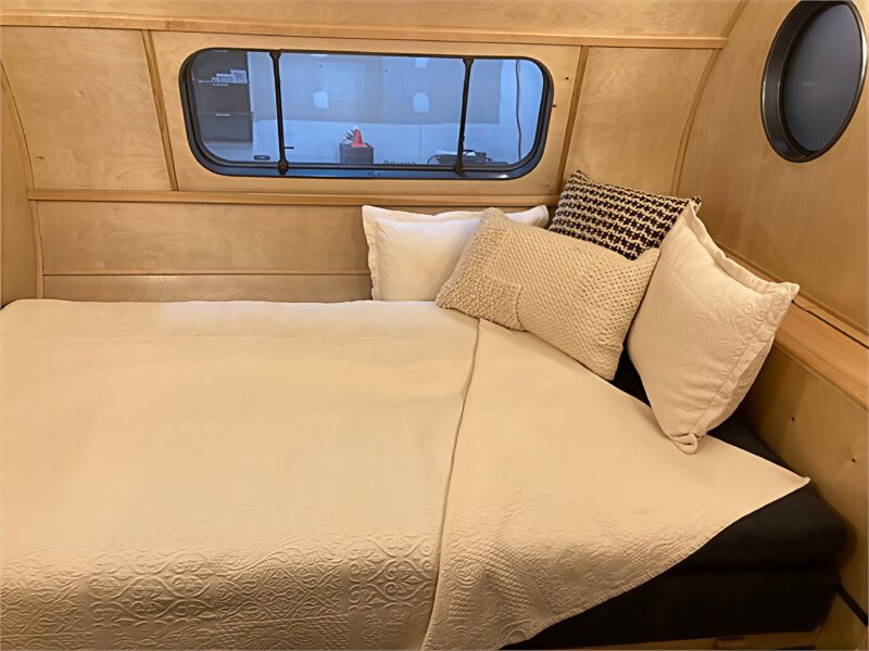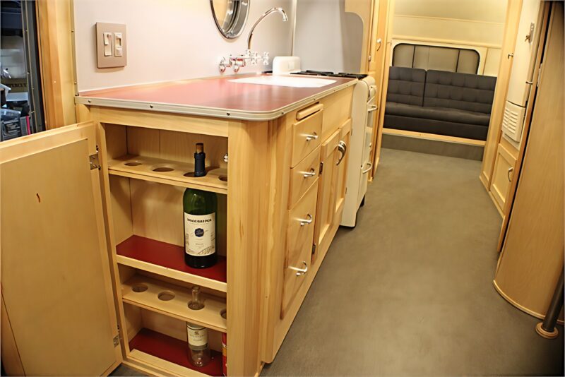 Inside, the blend of vintage style and modern convenience continues. New birch cabinetry—crafted using the originals as templates—lines the interior, finished in a clean lacquer. Period-correct Marmoleum flooring runs throughout, tying the space together. Front and rear futons provide seating by day and convert into double beds at night.