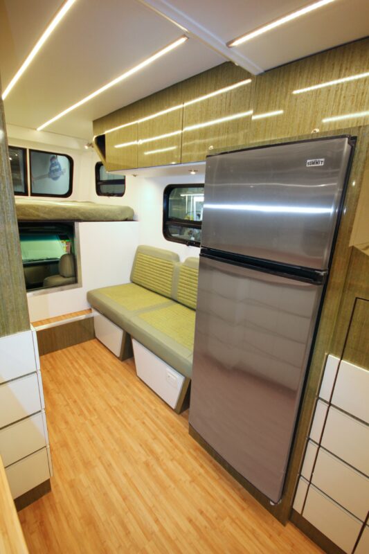 • The white “striped” counter bases are not only a very cool accent, they also serve as openings for all the doors/drawers (hiding the finger area at the bottom), there are catches inside to keep them closed while going down the road.