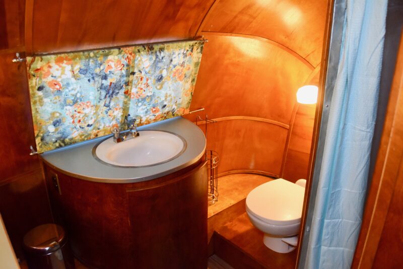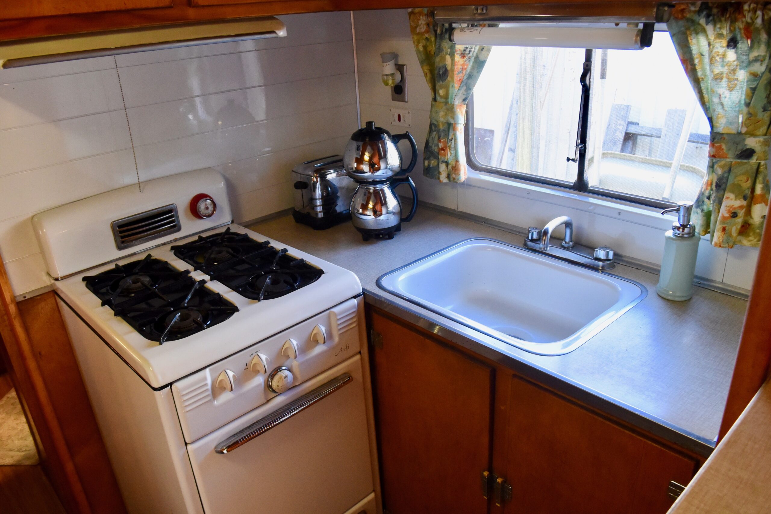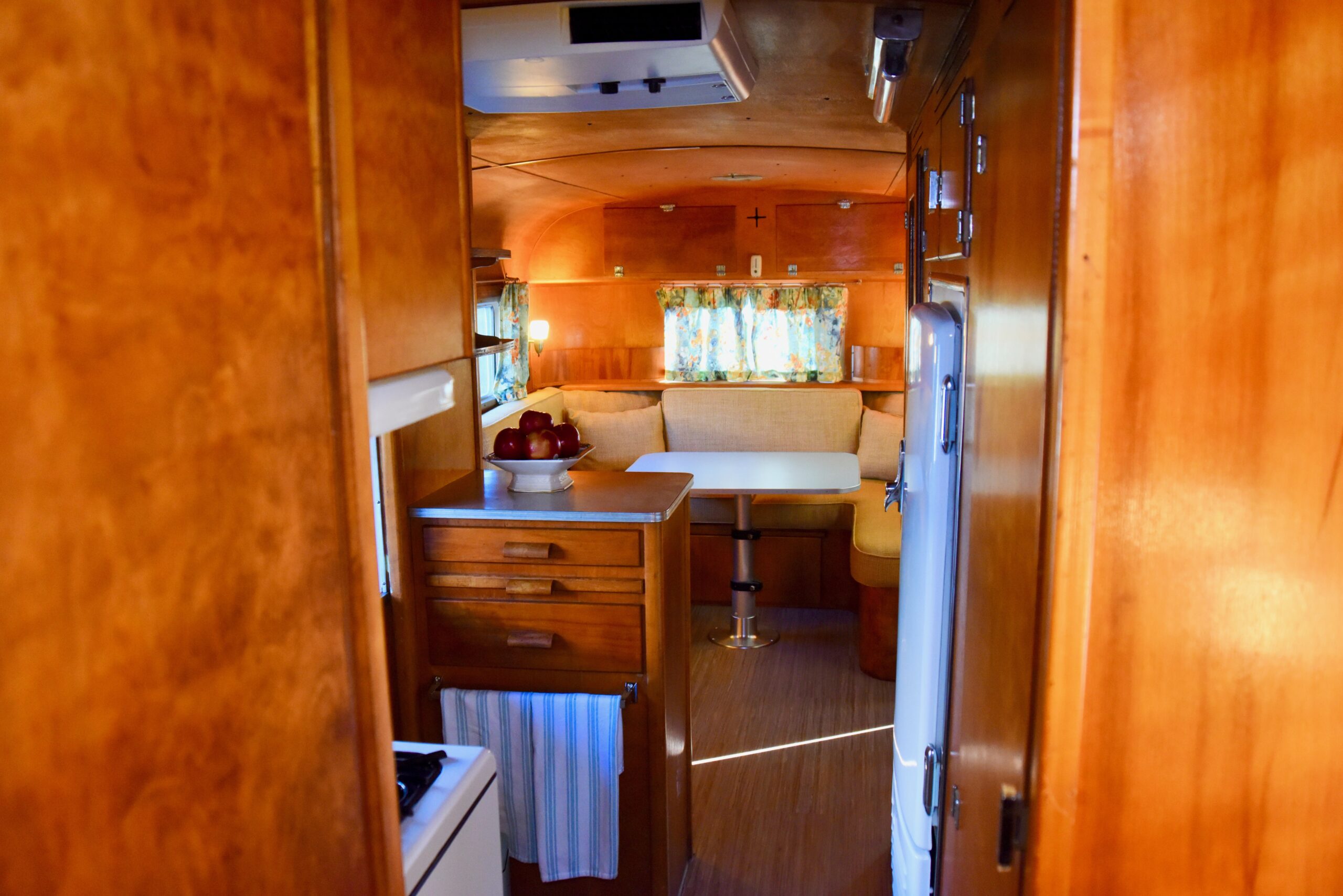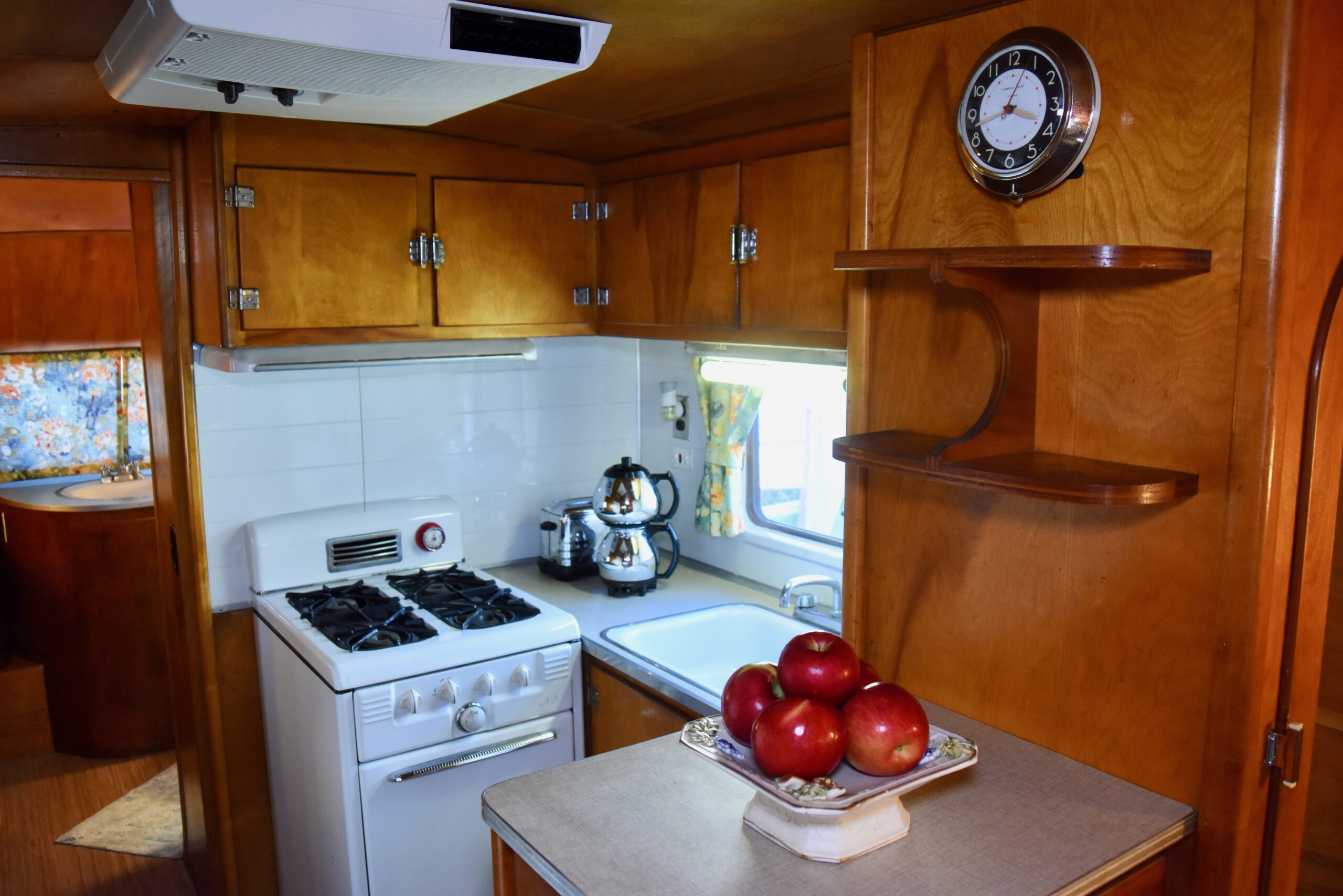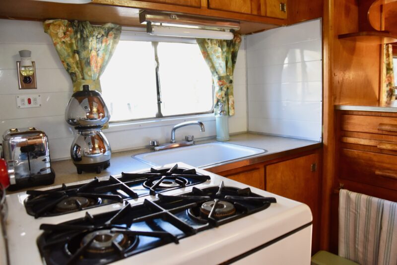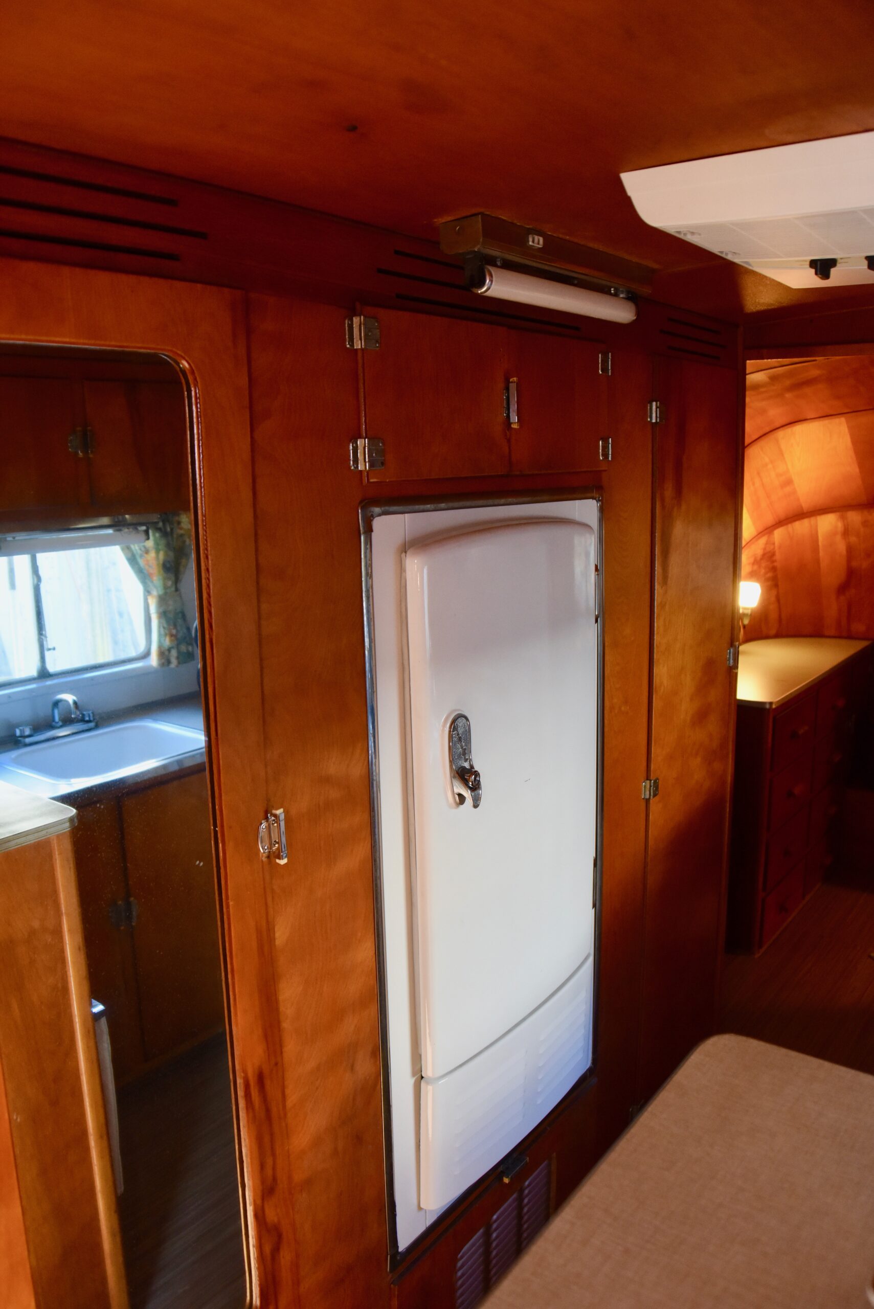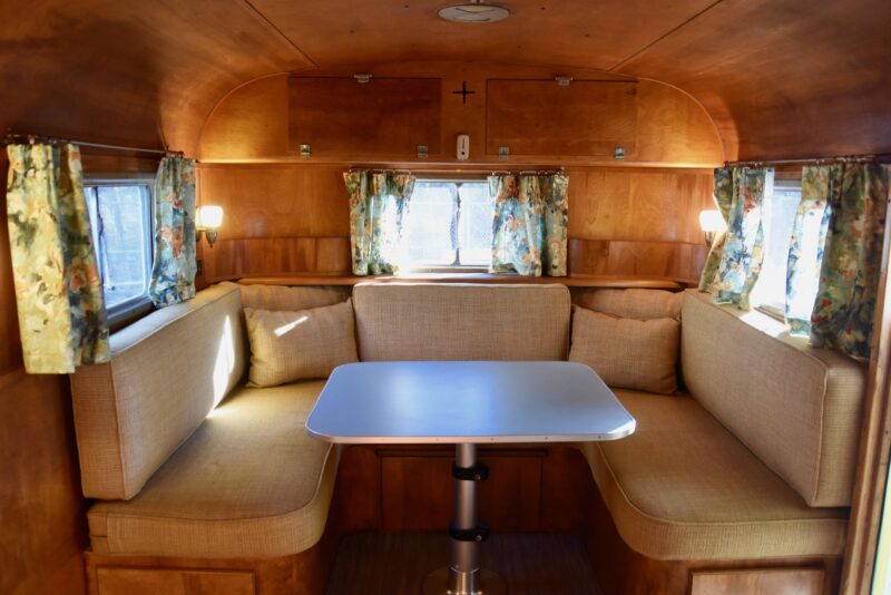 The restoration balanced preservation with thoughtful updates. The original rear bedroom was reimagined as a spacious bathroom, incorporating an aluminum shower unit from a 1951 Spartan, a cast iron sink, and a modern toilet. In contrast, the kitchen retained its vintage charm, with original countertops, backsplash, sink, Marvel refrigerator, and lighting intact. A custom dinette was built in the front, converting into a queen-size bed, while new Marmoleum flooring was installed to reflect authentic 1950s patterns.