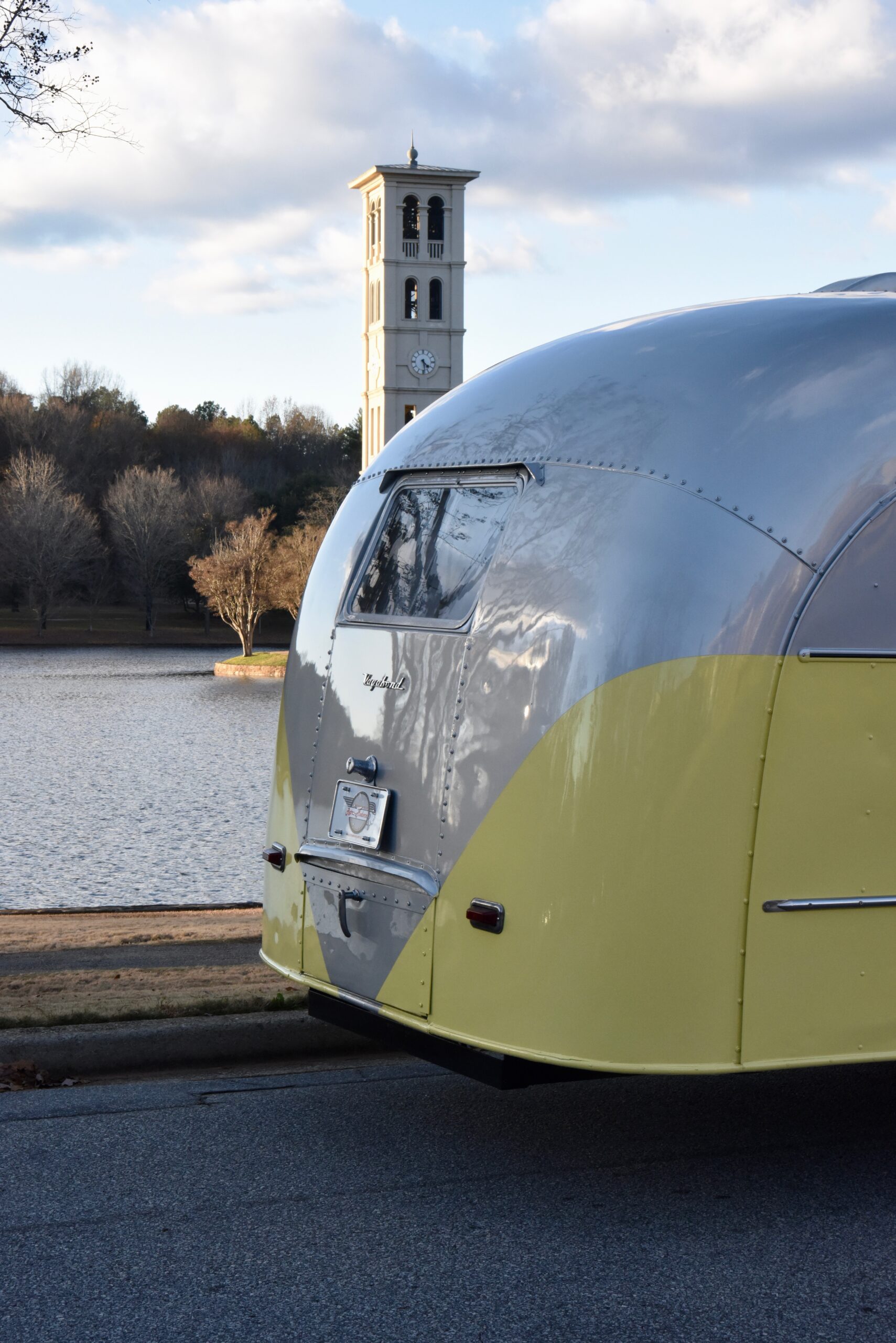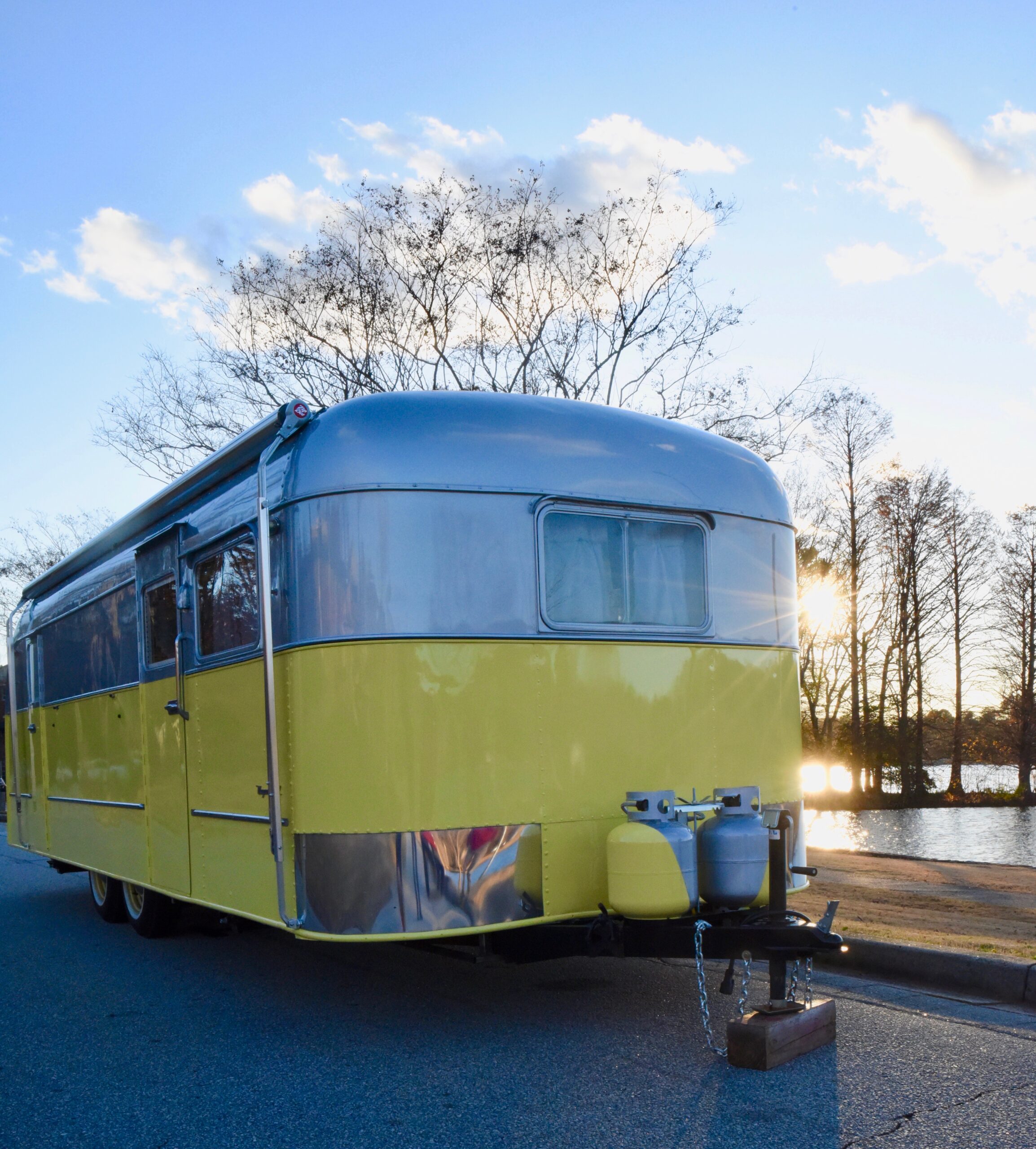 On the exterior, multiple layers of house paint and grime were removed through glass blasting, revealing a clean surface for a fresh finish. A two-tone daffodil yellow and metallic silver paint scheme replaced the original olive green, giving the trailer a bright, period-inspired look. A ZipDee awning was added to complement the design, and LED bulbs were fitted into the original exterior fixtures. Missing marker light lenses were recreated using modern 3D printing technology with translucent plastic.