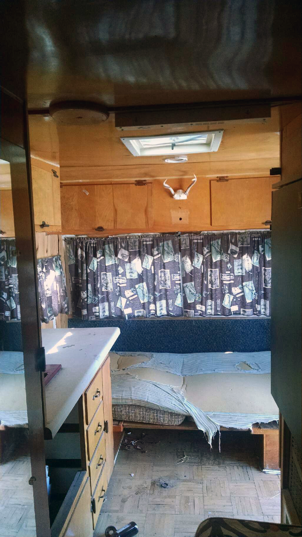 When the camper arrived, it was in rough shape—we were honestly surprised it made it down the highway. The seller had been using it as a hunting shack, and it even came with mounted deer antlers.