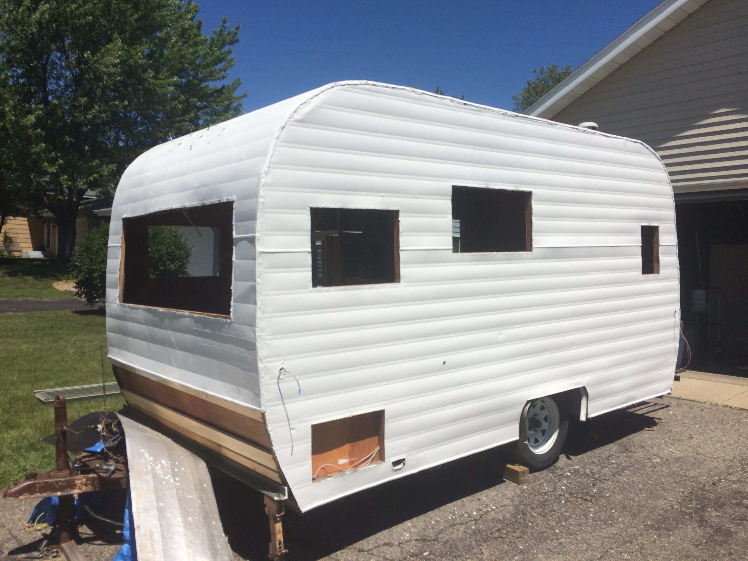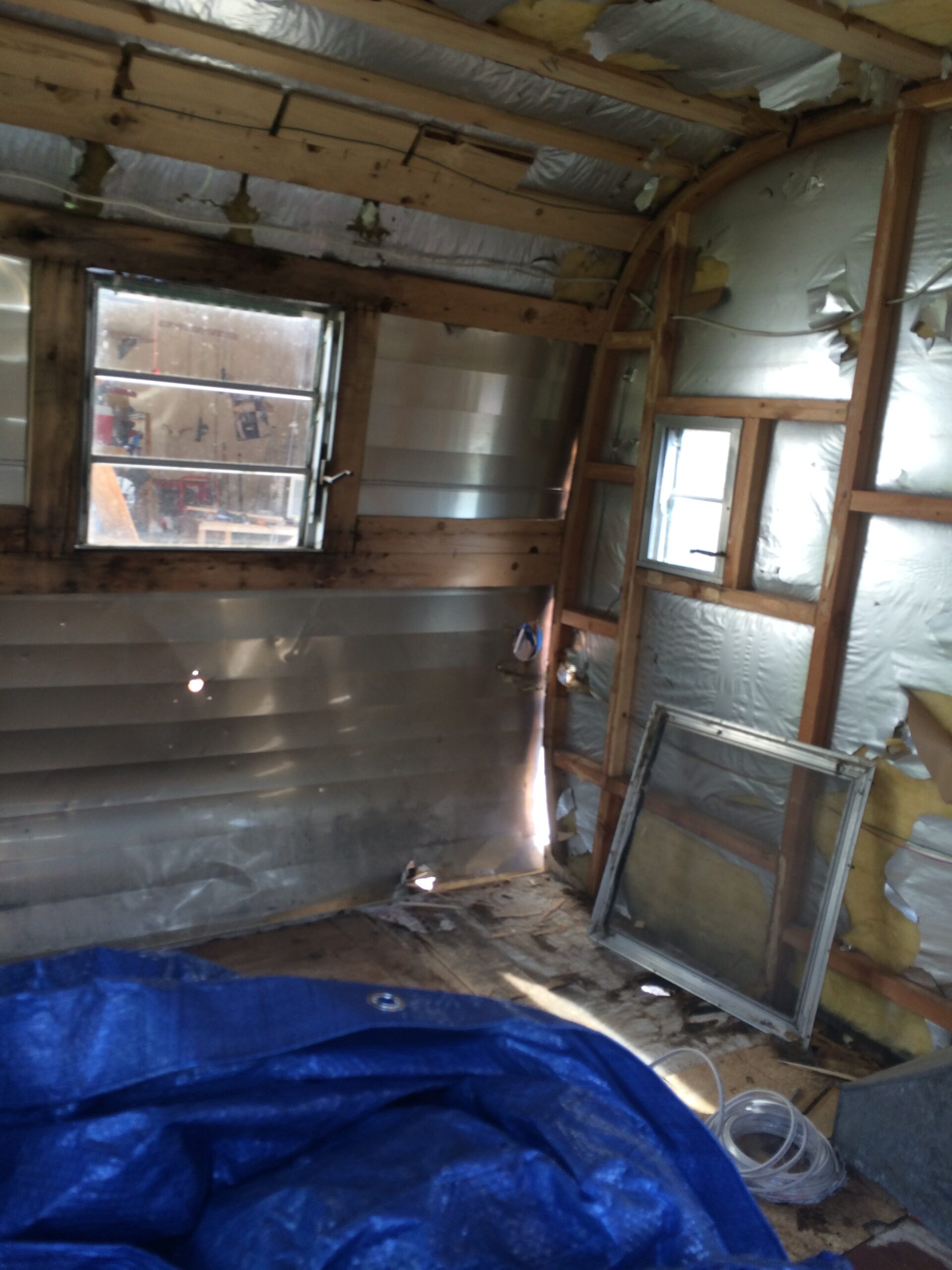 As we removed the rotting, moldy wood, we uncovered a few surprises: a snake skeleton, a mouse skeleton, two vintage aprons, and the original sales flyer. The aprons and flyer were a highlight—we turned the aprons into pillows and framed the sales flyer for the finished trailer.