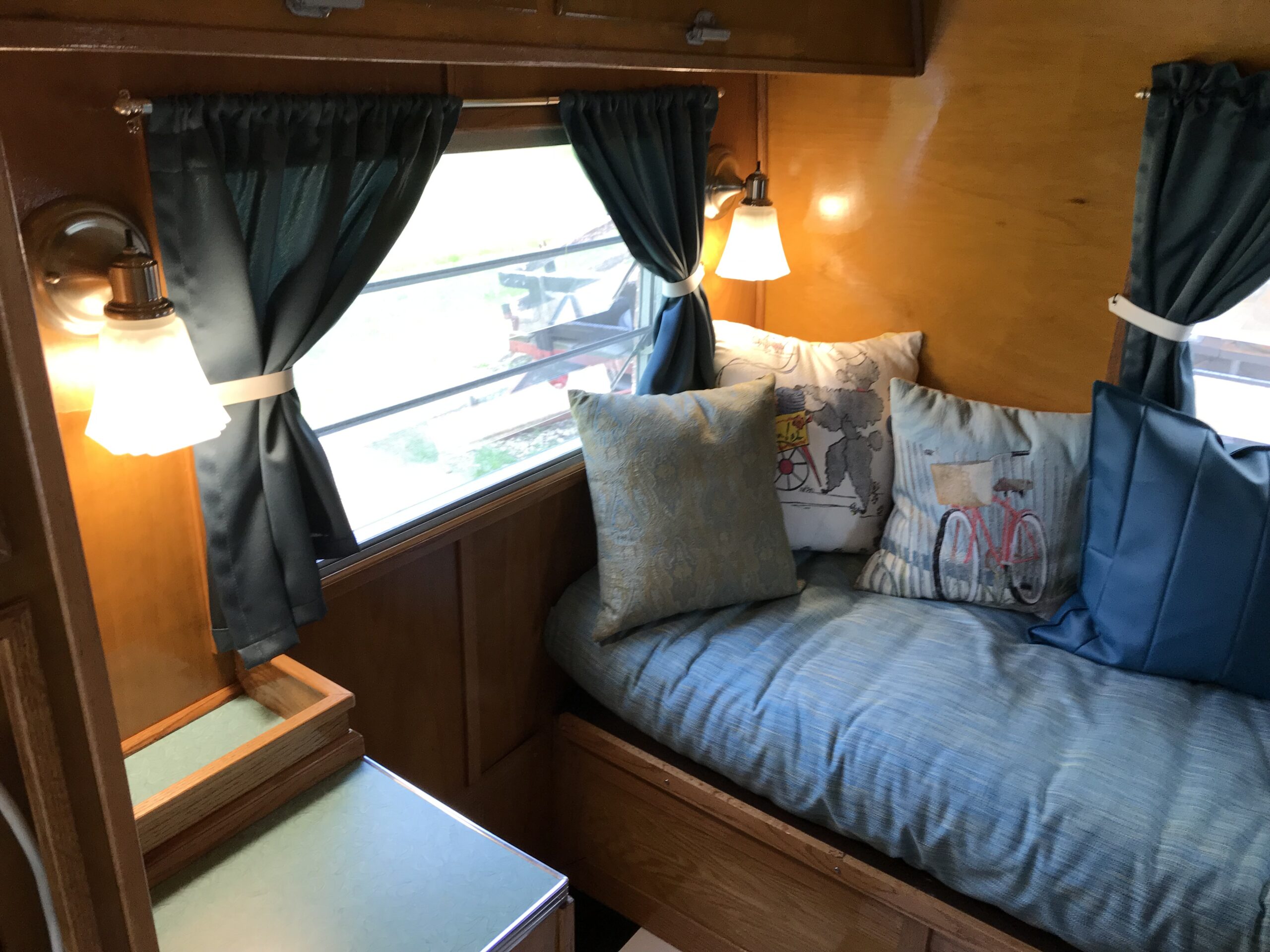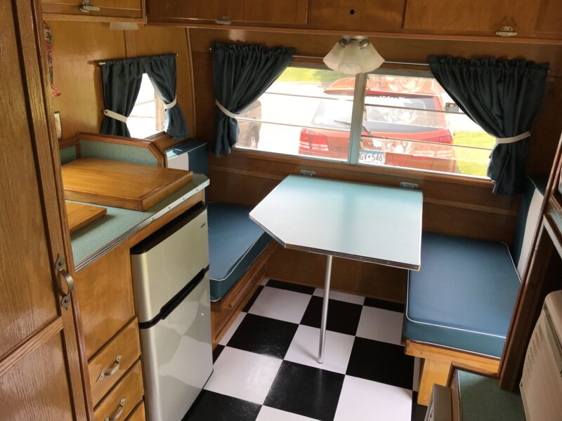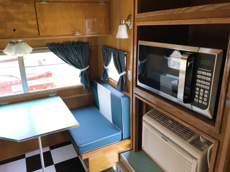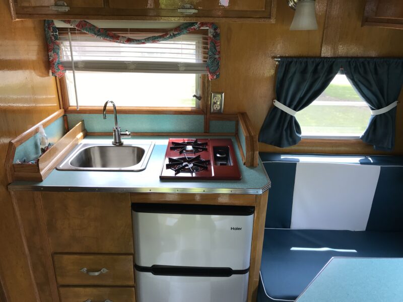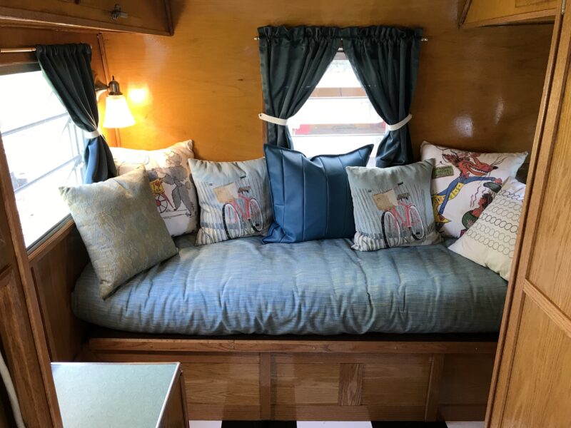To add modern conveniences, my husband built a custom cabinet to house an air conditioner, microwave, and furnace. At the same time, we aimed to preserve the original look of the 1962 Winnebago’s golden, varnished wood interior. We brought a sample to a local paint store to create a custom-matched stain. The original cupboards and hardware were retained, while the floor plan was modified to include a sofa bed and bathroom. We sewed new booth cushions and curtains, used a futon mattress for the sofa/bed, and sourced vintage lighting from a secondhand store. The exterior was repainted, keeping the original Winnebago stripe design intact.