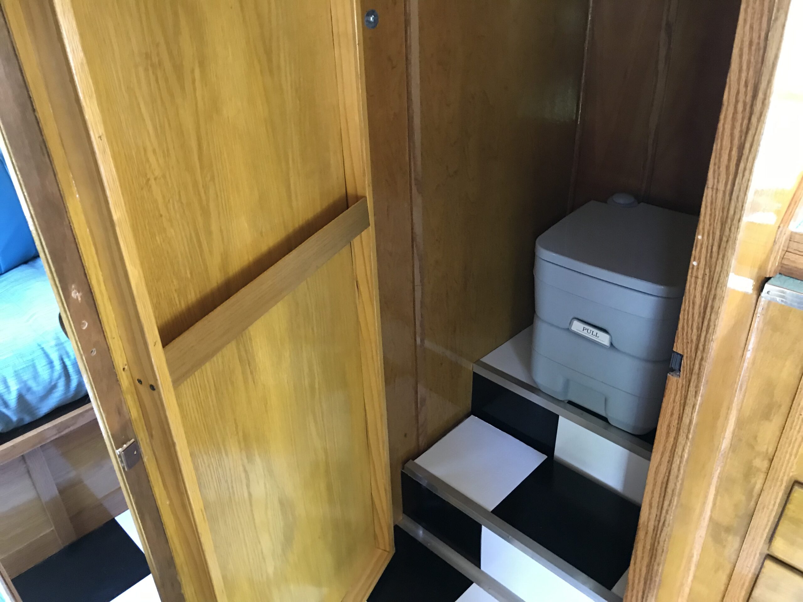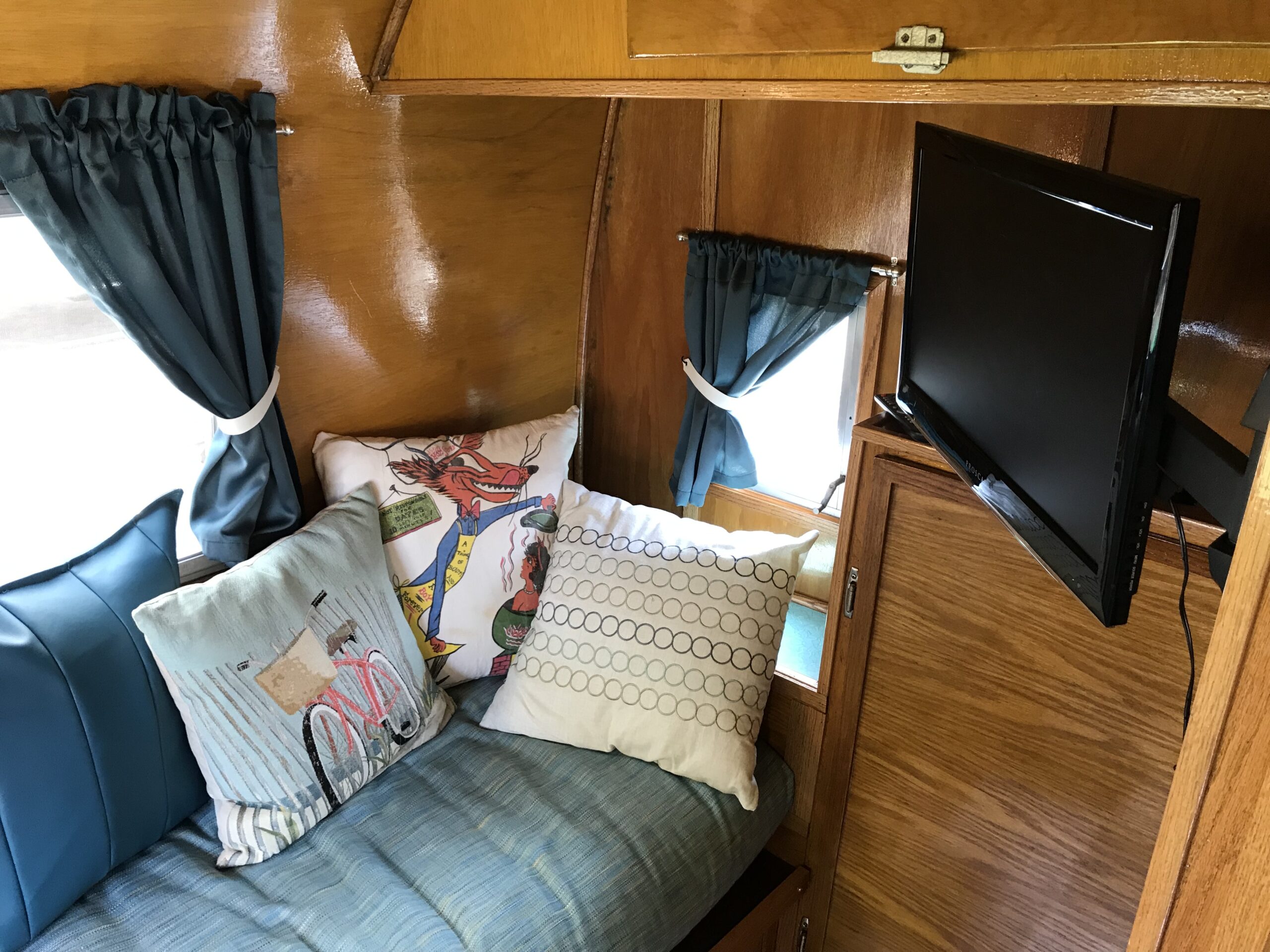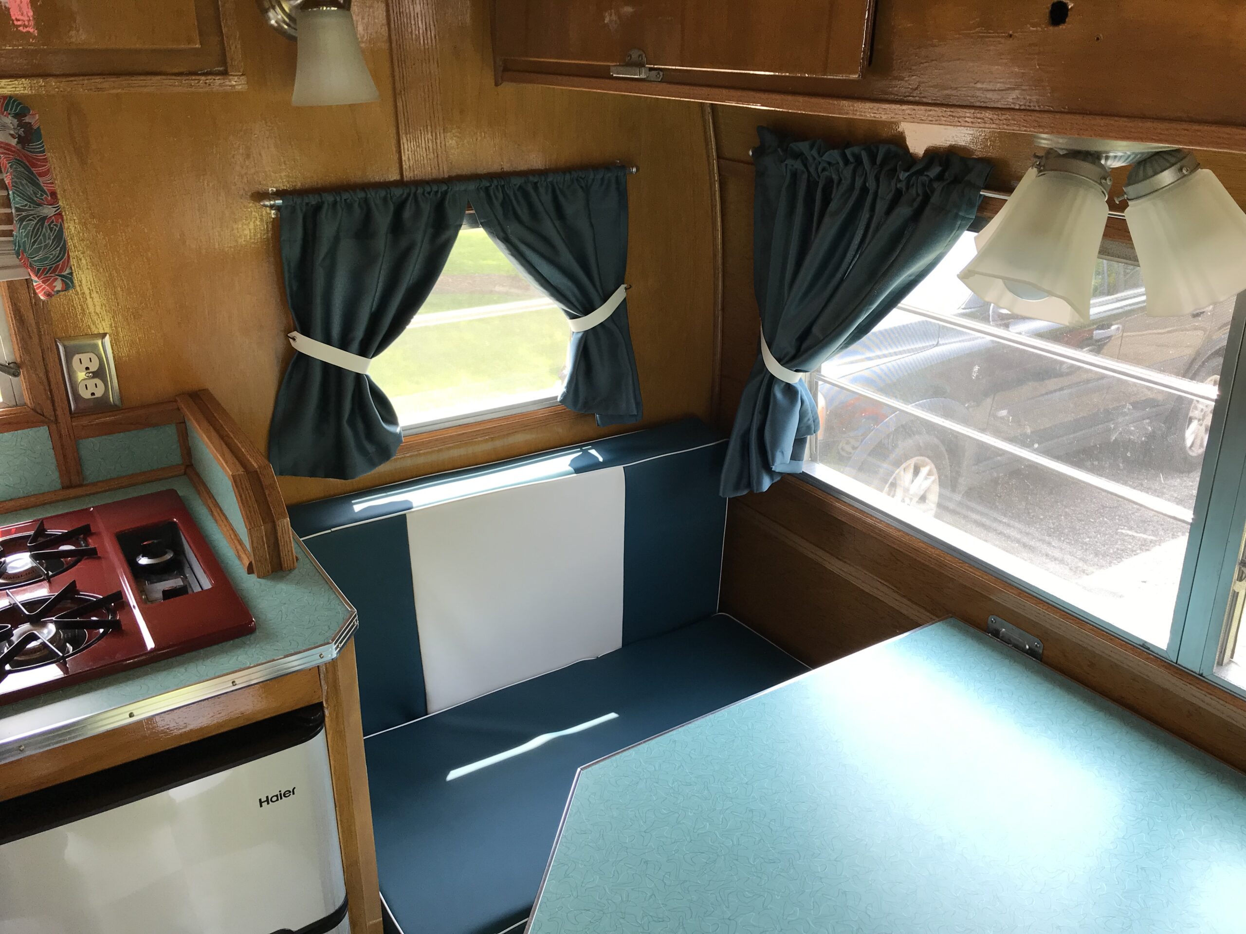 To add modern conveniences, my husband built a custom cabinet to house an air conditioner, microwave, and furnace. At the same time, we aimed to preserve the original look of the 1962 Winnebago’s golden, varnished wood interior. We brought a sample to a local paint store to create a custom-matched stain. The original cupboards and hardware were retained, while the floor plan was modified to include a sofa bed and bathroom. We sewed new booth cushions and curtains, used a futon mattress for the sofa/bed, and sourced vintage lighting from a secondhand store. The exterior was repainted, keeping the original Winnebago stripe design intact.