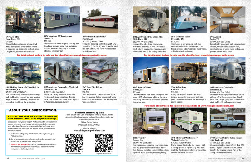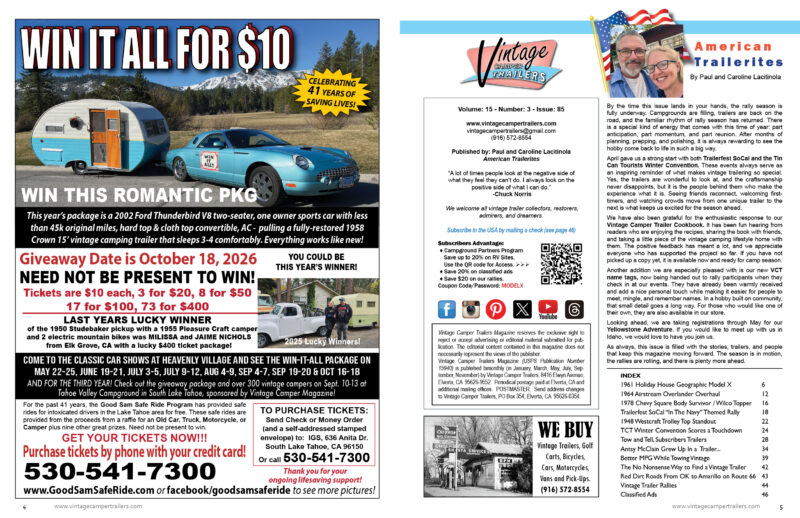 We’ve also included more of the people side of the hobby with our Tow & Tell subscriber features, where real trailerites share their stories, photos, and projects. Add in a feature on Antsy McClain, a practical piece on chasing better MPG while towing a vintage trailer, our latest rally calendar, and a fresh batch of classified ads, and you’ve got a well-rounded issue that reflects what Vintage Camper Trailers Magazine is all about.