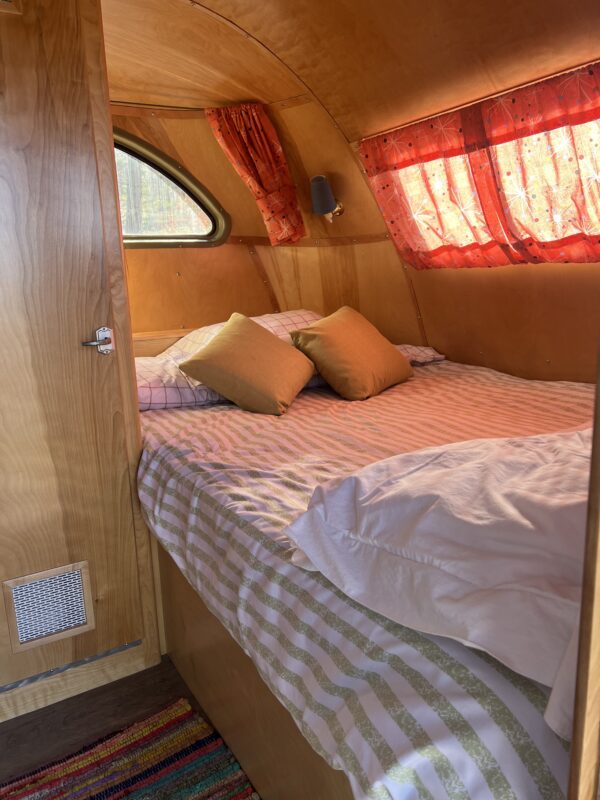 Step inside and the craftsmanship immediately stands out. Custom cabinetry fills the space, all built in natural birch to stay true to the original look and feel. The layout follows the factory 1947 design, with original-style doors, drawers, hinges, and pulls reused wherever possible. Even the original wall sconce lighting remains—updated to be dual voltage—adding just the right amount of period charm. A copper screen on the entry door and solid birch framing continue that thoughtful attention to detail.