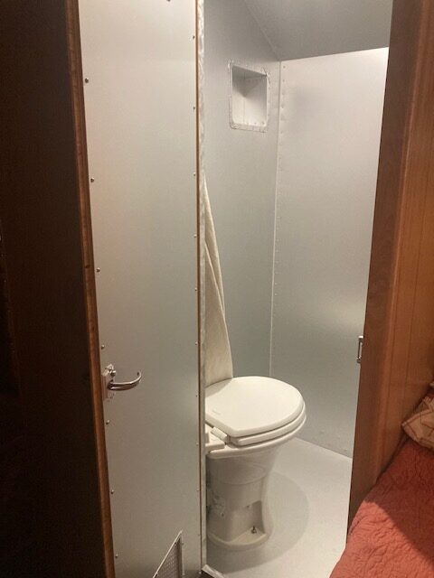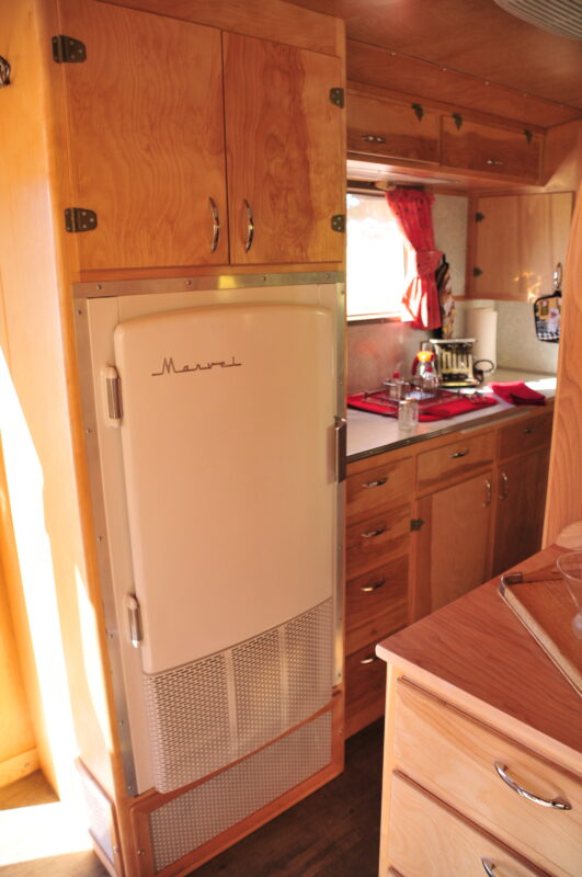 Comfort wasn’t overlooked either. The walls and ceiling are fully insulated with fiberglass, and the ceiling includes a reflective Energy Q membrane to help keep things cooler on warm summer days. While not original, a discreetly added air conditioner makes modern travel much more enjoyable. The refrigerator is a vintage Marvel unit from a same-era Airstream, and it works exactly as designed—right down to accepting a block of ice when electricity isn’t available.