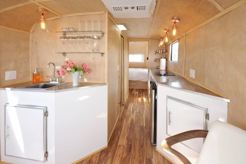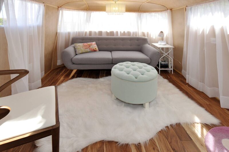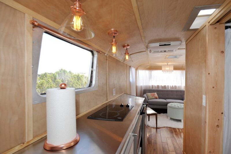 A good example of this growing trend can be found near Santa Fe, where a beautifully restored Spartan Manor serves as a countryside guest retreat. Built in 1948, the trailer has been thoughtfully updated while retaining its mid-century character. Inside, visitors find many of the comforts expected in modern lodging: a queen-sized bed, a compact kitchen equipped with a coffee maker, microwave, cooktop, and small refrigerator, and a full bathroom with shower. These upgrades allow guests to enjoy vintage design without sacrificing convenience.